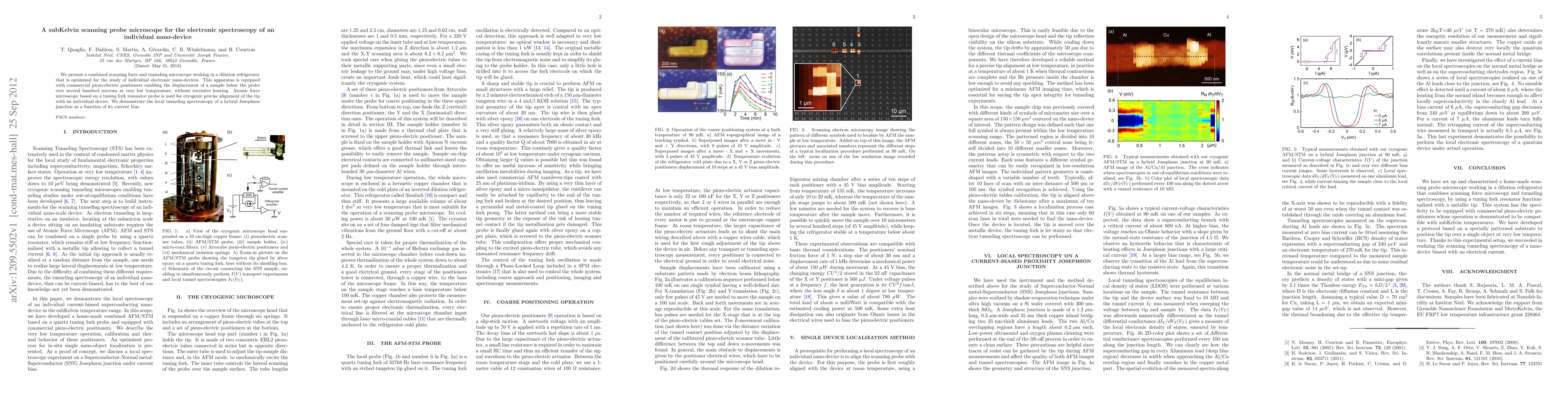 This paper introduces a sub-Kelvin scanning probe microscope combining atomic force and tunneling microscopy for precise alignment and spectroscopy of individual nano-devices. The apparatus enables local tunneling spectroscopy of a hybrid Josephson junction at cryogenic temperatures.