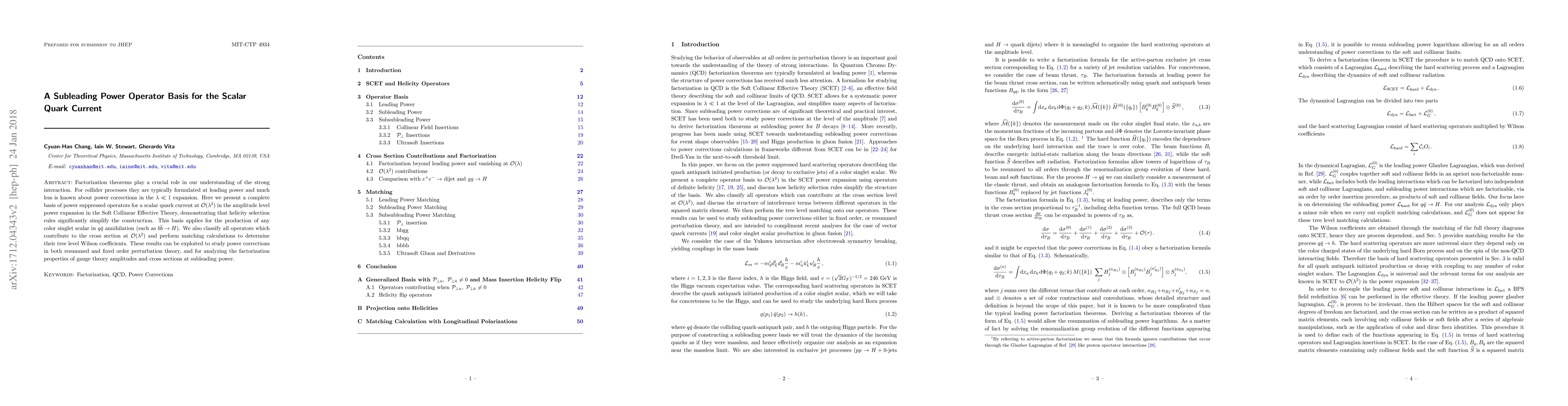 Factorization theorems play a crucial role in our understanding of the strong interaction. For collider processes they are typically formulated at leading power and much less is known about power corrections in the $\lambda\ll 1$ expansion. Here we present a complete basis of power suppressed operators for a scalar quark current at $\mathcal{O}(\lambda^2)$ in the amplitude level power expansion in the Soft Collinear Effective Theory, demonstrating that helicity selection rules significantly simplify the construction. This basis applies for the production of any color singlet scalar in $q\bar{q}$ annihilation (such as $b \bar b \to H$). We also classify all operators which contribute to the cross section at $\mathcal{O}(\lambda^2)$ and perform matching calculations to determine their tree level Wilson coefficients. These results can be exploited to study power corrections in both resummed and fixed order perturbation theory, and for analyzing the factorization properties of gauge theory amplitudes and cross sections at subleading power.