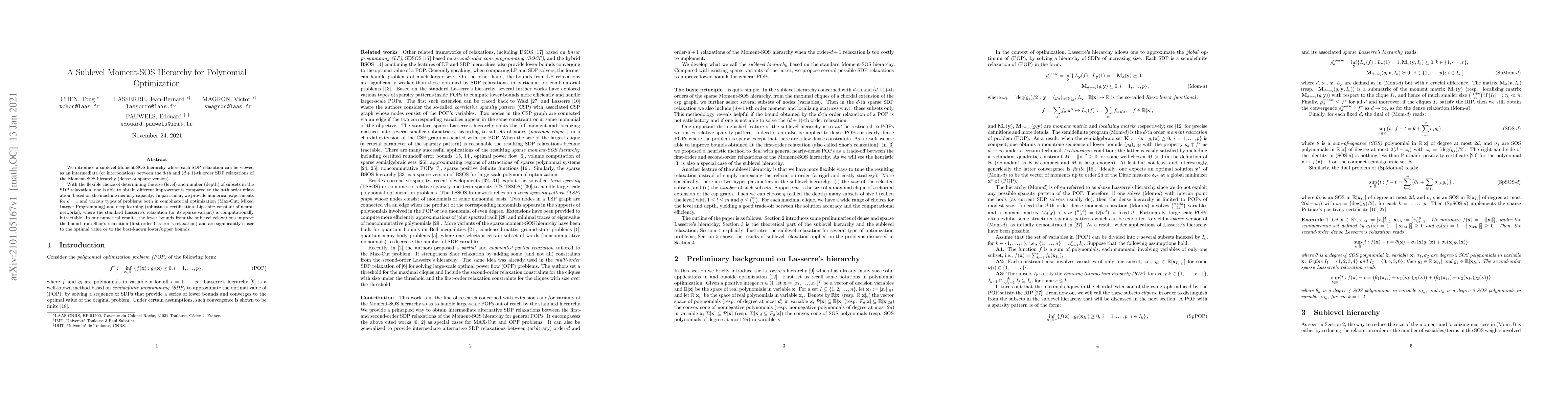 This paper proposes a sublevel Moment-SOS hierarchy for polynomial optimization, offering intermediate SDP relaxations that improve upon the d-th order relaxation. The method is shown to provide better bounds in combinatorial and deep learning problems compared to standard Lasserre's relaxations.