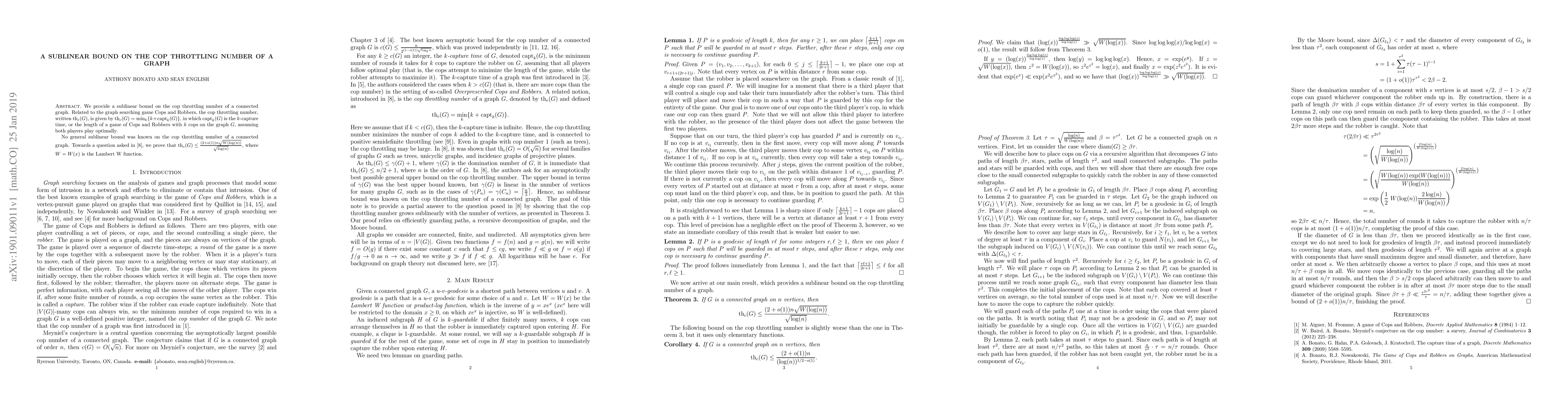 We provide a sublinear bound on the cop throttling number of a connected graph. Related to the graph searching game Cops and Robbers, the cop throttling number, written $\mathrm{th}_c(G)$, is given by $\mathrm{th}_c(G)=\min_k\{k+\mathrm{capt}_k(G)\}$, in which $\mathrm{capt}_k(G)$ is the $k$-capture time, or the length of a game of Cops and Robbers with $k$ cops on the graph $G$, assuming both players play optimally. No general sublinear bound was known on the cop throttling number of a connected graph. Towards a question asked by Breen et al., we prove that $\mathrm{th}_c(G)\leq \frac{(2+o(1))n\sqrt{W(\log(n))}}{\sqrt{\log(n)}},$ where $W=W(x)$ is the Lambert W function.
