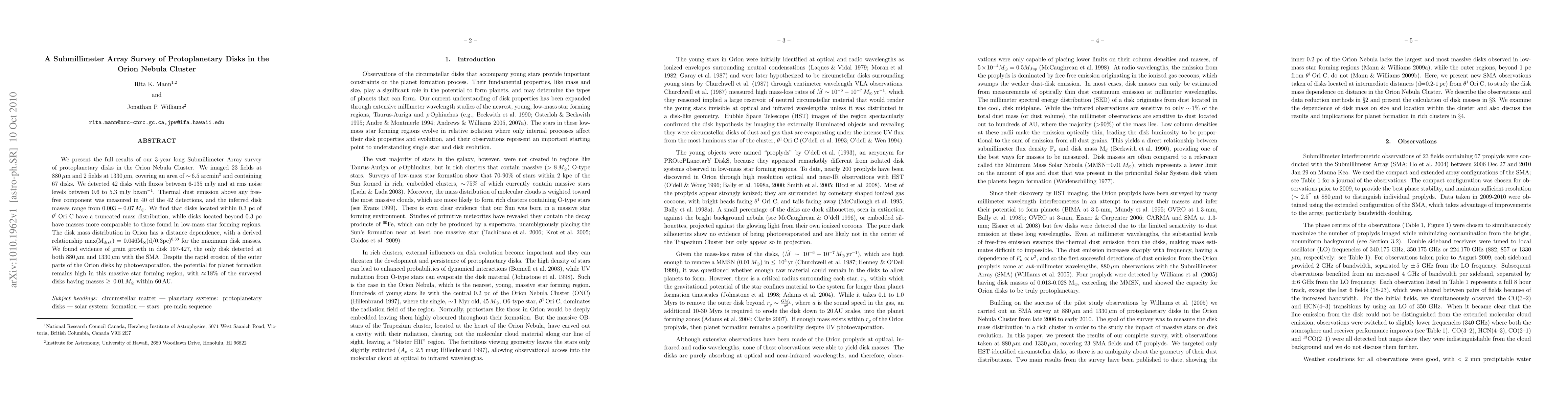 We present the full results of our 3-year long Submillimeter Array survey of protoplanetary disks in the Orion Nebula Cluster. We imaged 23 fields at 880 microns and 2 fields at 1330 microns, covering an area of ~6.5 arcmin^2 and containing 67 disks. We detected 42 disks with fluxes between 6-135 mJy and at rms noise levels between 0.6 to 5.3 mJy/beam. Thermal dust emission above any free-free component was measured in 40 of the 42 detections, and the inferred disk masses range from 0.003-0.07 Msolar. We find that disks located within 0.3 pc of theta^1 Ori C have a truncated mass distribution, while disks located beyond 0.3 pc have masses more comparable to those found in low-mass star forming regions. The disk mass distribution in Orion has a distance dependence, with a derived relationship max(M_(disk)) = 0.046Msolar(d/0.3pc)^0.33 for the maximum disk masses. We found evidence of grain growth in disk 197-427, the only disk detected at both 880 microns and 1330 microns with the SMA. Despite the rapid erosion of the outer parts of the Orion disks by photoevaporation, the potential for planet formation remains high in this massive star forming region, with approximately 18% of the surveyed disks having masses greater than or equal to 0.01 Msolar within 60 AU.