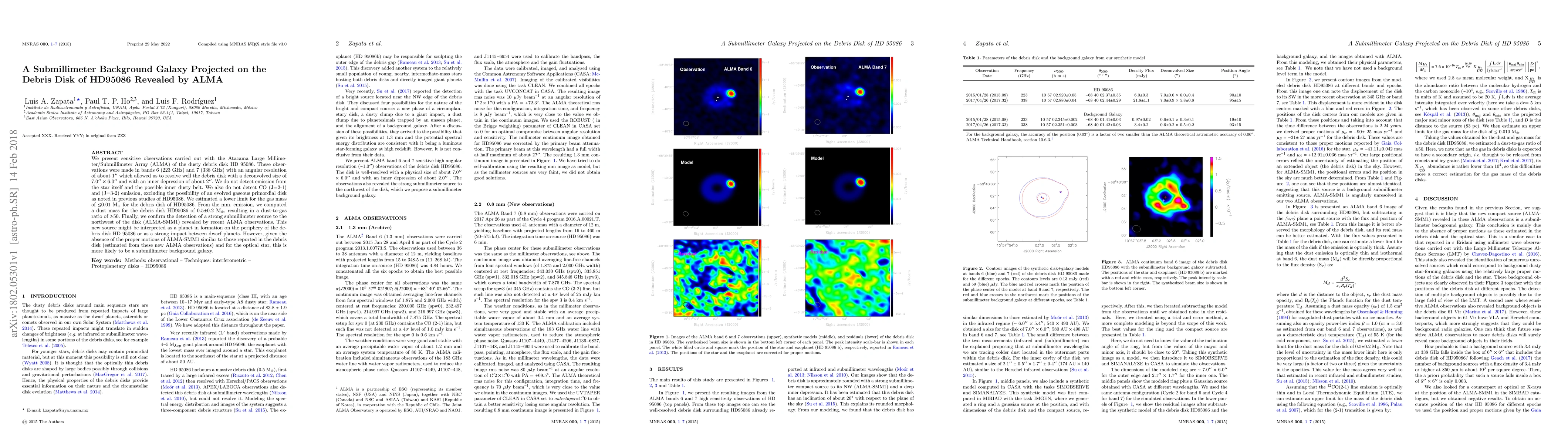 The study, using ALMA, observed the debris disk of HD 95086 in submillimeter wavelengths, revealing no CO emission, ruling out a gaseous primordial disk. The dust mass was estimated at 0.5±0.2 M⊕, with a dust-to-gas ratio of ≥50. A strong submillimeter source (ALMA-SMM1) was detected, likely a background galaxy rather than a forming planet, based on lack of proper motion similar to the disk or star.