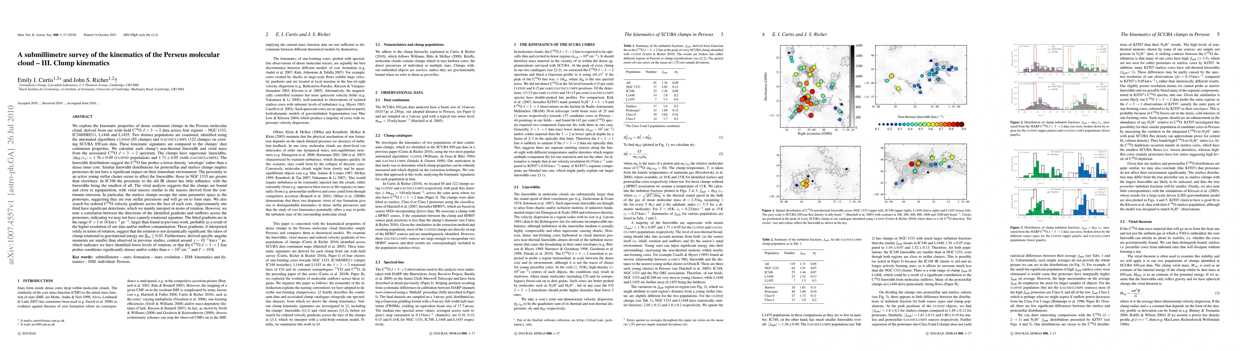 We explore the kinematics of continuum clumps in the Perseus molecular cloud, derived from C18O J=3-2 data. Two populations are examined, identified using the automated algorithms CLFIND and GAUSSCLUMPS on existing SCUBA data. The clumps have supersonic linewidths with distributions which suggest the C18O line probes a lower-density 'envelope' rather than a dense inner core. Similar linewidth distributions for protostellar and starless clumps implies protostars do not have a significant impact on their immediate environment. The proximity to an active young stellar cluster seems to affect the linewidths: those in NGC1333 are greater than elsewhere. In IC348 the proximity to the old IR cluster has little influence, with the linewidths being the smallest of all. A virial analysis suggests that the clumps are bound and close to equipartition. In particular, the starless clumps occupy the same parameter space as the protostars, suggesting they are true stellar precursors and will go on to form stars. We also search for ordered C18O velocity gradients across the face of each core, usually interpreted as rotation. We note a correlation between the directions of the identified gradients and outflows across protostars, indicating we may not have a purely rotational signature. The fitted gradients are larger than found in previous work, probably as a result of the higher resolution of our data and/or outflow contamination. These gradients, if interpreted solely in terms of rotation, suggest that rotation is not dynamically significant. Furthermore, derived specific angular momenta are smaller than observed in previous studies, centred around j~0.001 km/s pc, which indicates we have identified lower levels of rotation, or that the C18O J=3-2 line probes conditions significantly denser and/or colder than n~10^5 per cc and T~10 K.