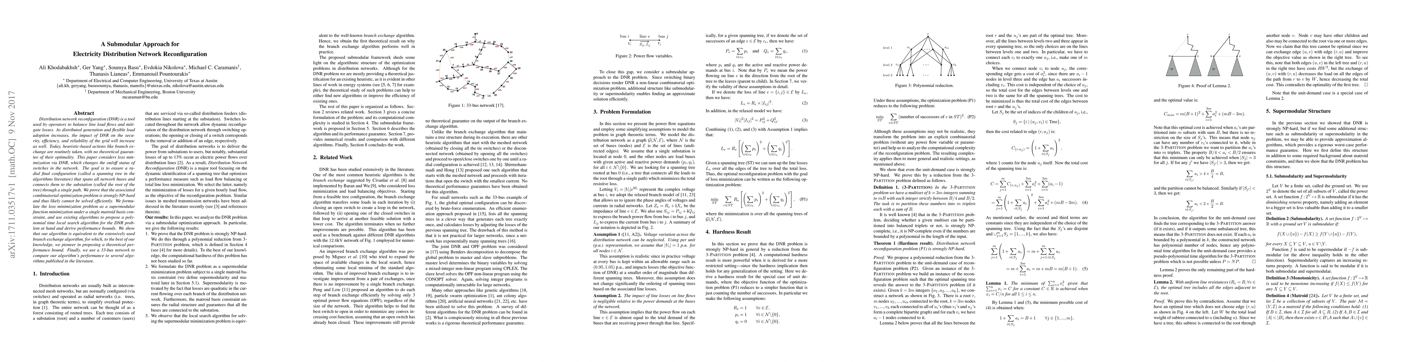 This paper proposes a submodular function minimization approach for optimizing electricity distribution network reconfiguration to minimize losses. The authors develop a polynomial time local search algorithm and provide theoretical performance bounds, demonstrating its equivalence to the branch exchange method and comparing it against existing algorithms on a 33-bus network.