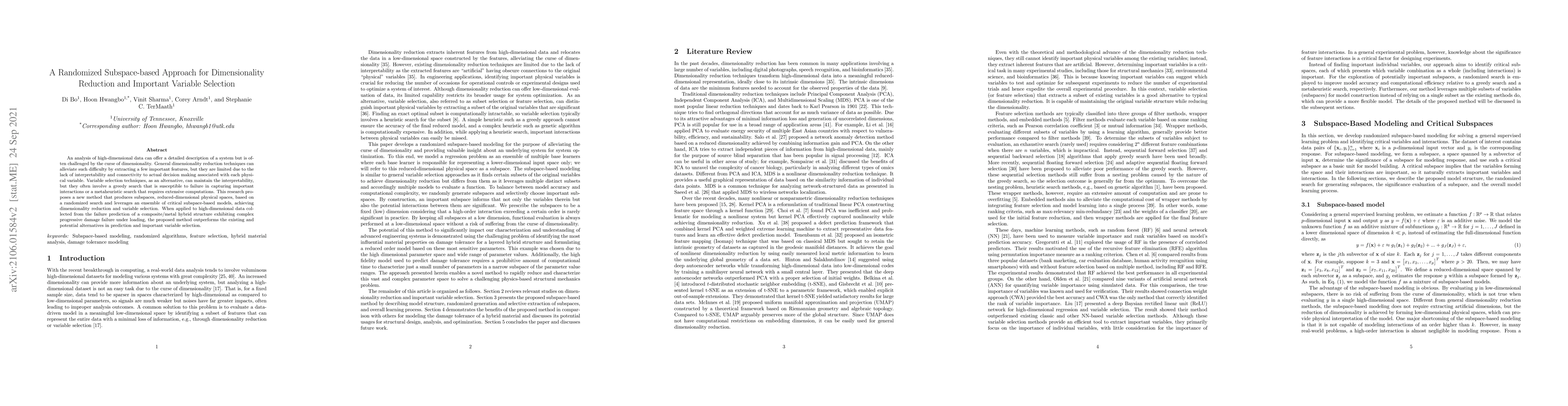 An analysis of high-dimensional data can offer a detailed description of a system but is often challenged by the curse of dimensionality. General dimensionality reduction techniques can alleviate such difficulty by extracting a few important features, but they are limited due to the lack of interpretability and connectivity to actual decision making associated with each physical variable. Variable selection techniques, as an alternative, can maintain the interpretability, but they often involve a greedy search that is susceptible to failure in capturing important interactions or a metaheuristic search that requires extensive computations. This research proposes a new method that produces subspaces, reduced-dimensional physical spaces, based on a randomized search and leverages an ensemble of critical subspace-based models, achieving dimensionality reduction and variable selection. When applied to high-dimensional data collected from the failure prediction of a composite/metal hybrid structure exhibiting complex progressive damage failure under loading, the proposed method outperforms the existing and potential alternatives in prediction and important variable selection.