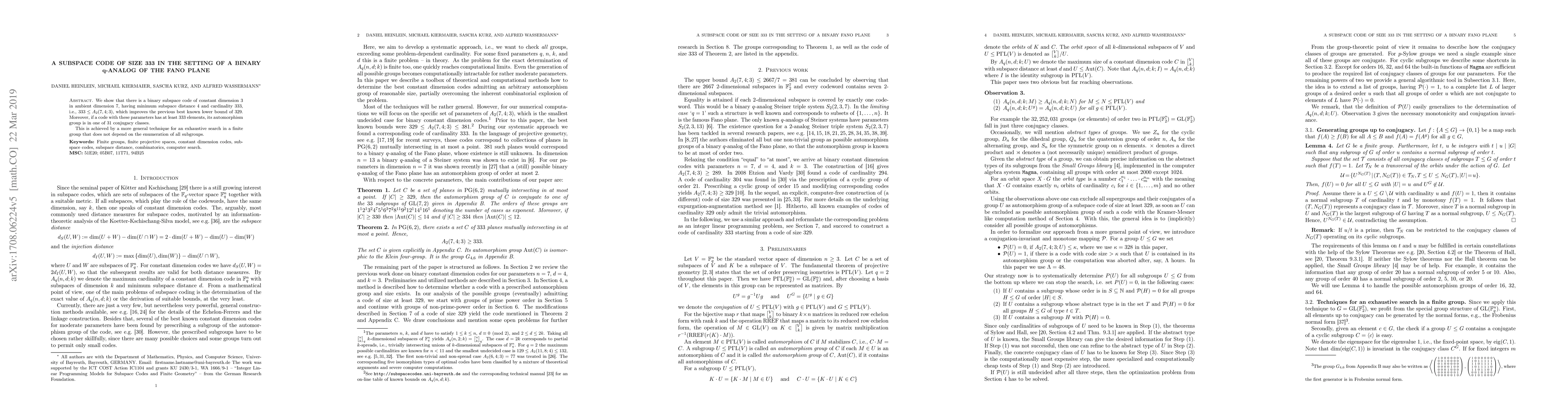 We show that there is a binary subspace code of constant dimension 3 in ambient dimension 7, having minimum distance 4 and cardinality 333, i.e., $333 \le A_2(7,4;3)$, which improves the previous best known lower bound of 329. Moreover, if a code with these parameters has at least 333 elements, its automorphism group is in one of $31$ conjugacy classes. This is achieved by a more general technique for an exhaustive search in a finite group that does not depend on the enumeration of all subgroups.