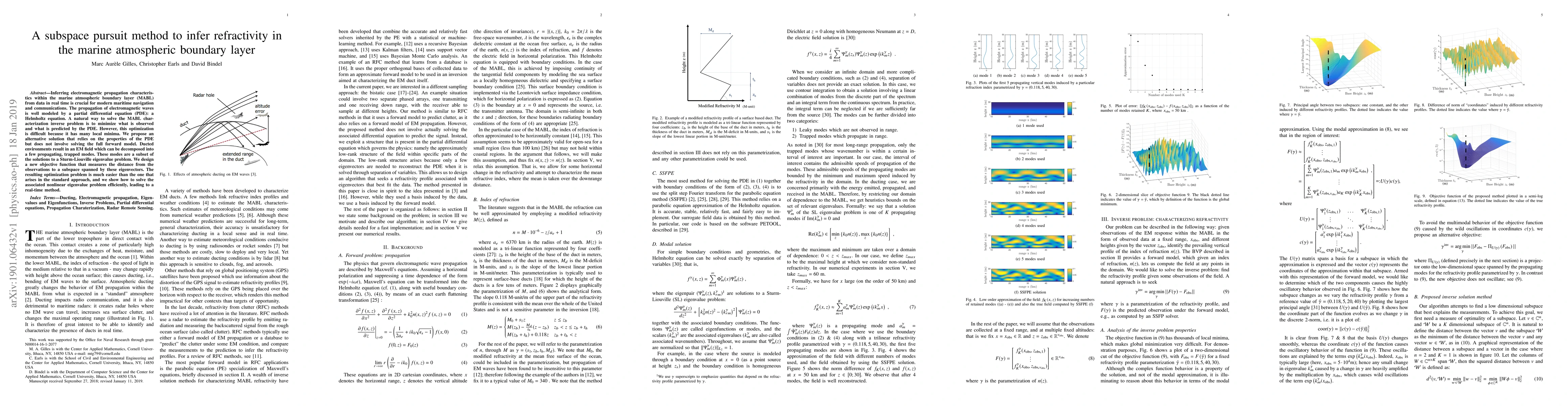 Inferring electromagnetic propagation characteristics within the marine atmospheric boundary layer (MABL) from data in real time is crucial for modern maritime navigation and communications. The propagation of electromagnetic waves is well modeled by a partial differential equation (PDE): a Helmholtz equation. A natural way to solve the MABL characterization inverse problem is to minimize what is observed and what is predicted by the PDE. However, this optimization is difficult because it has many local minima. We propose an alternative solution that relies on the properties of the PDE but does not involve solving the full forward model. Ducted environments result in an EM field which can be decomposed into a few propagating, trapped modes. These modes are a subset of the solutions to a Sturm-Liouville eigenvalue problem. We design a new objective function that measures the distance from the observations to a subspace spanned by these eigenvectors. The resulting optimization problem is much easier than the one that arises in the standard approach, and we show how to solve the associated nonlinear eigenvalue problem efficiently, leading to a real-time method.