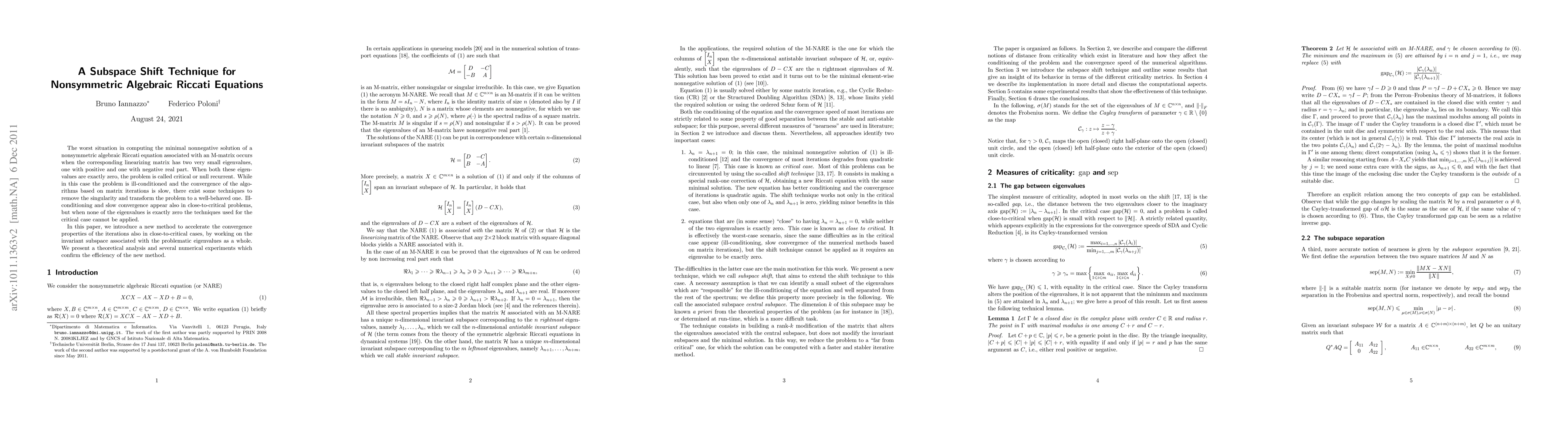 This paper introduces a subspace shift technique to accelerate the convergence of algorithms solving nonsymmetric algebraic Riccati equations, particularly in close-to-critical cases where eigenvalues are nearly zero. The method focuses on the invariant subspace associated with problematic eigenvalues, offering improved convergence over existing techniques.