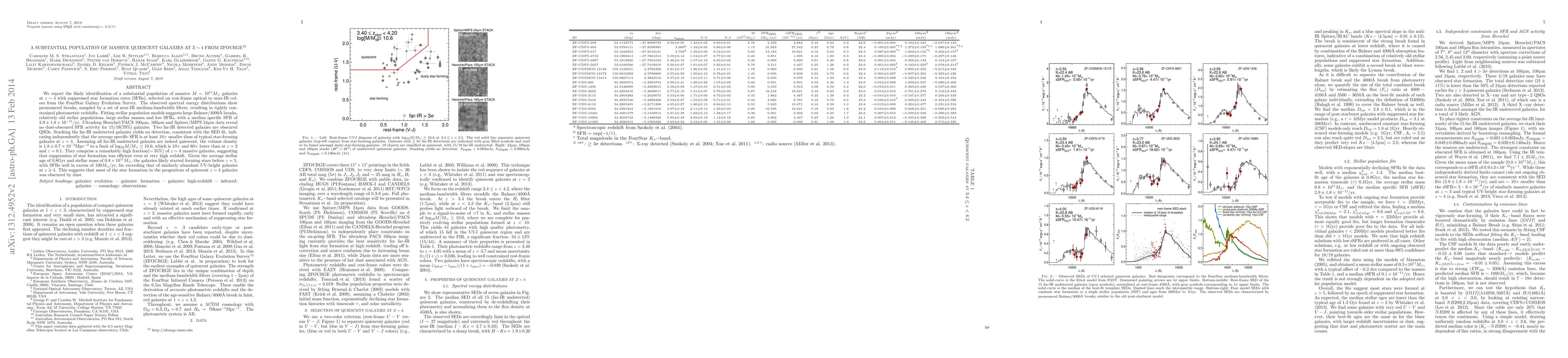 The study identifies a significant population of massive, quiescent galaxies at z~4 with suppressed star formation, selected through optical to near-IR colors. These galaxies exhibit old stellar populations and low specific star formation rates, with a majority showing no dust-obscured star formation activity.