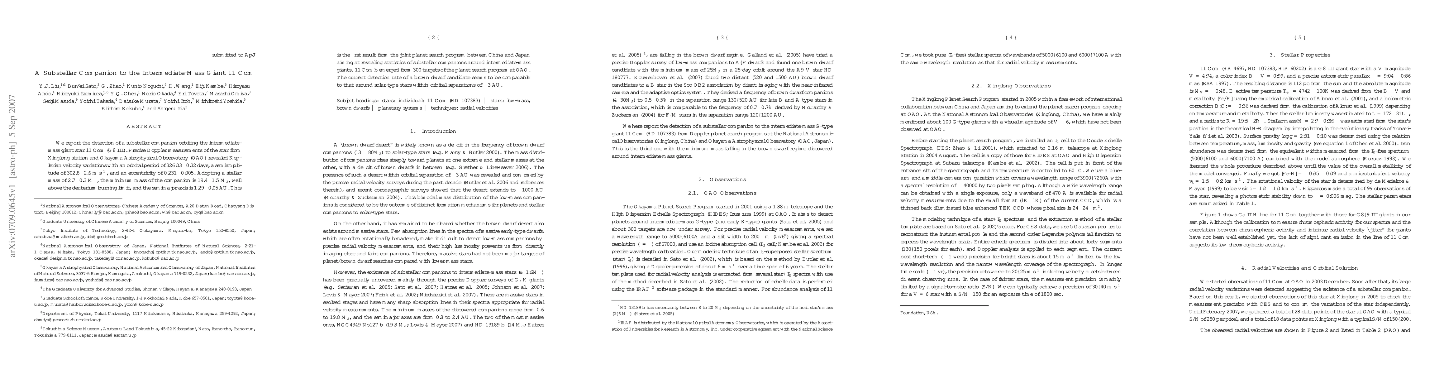 This paper reports the detection of a substellar companion, 11 Com b, orbiting the intermediate-mass giant star 11 Com, with a minimum mass of 19.4 M_Jupiter, indicating it is a brown dwarf. The companion has an orbital period of 326.03 days and is found through joint planet search efforts between China and Japan.