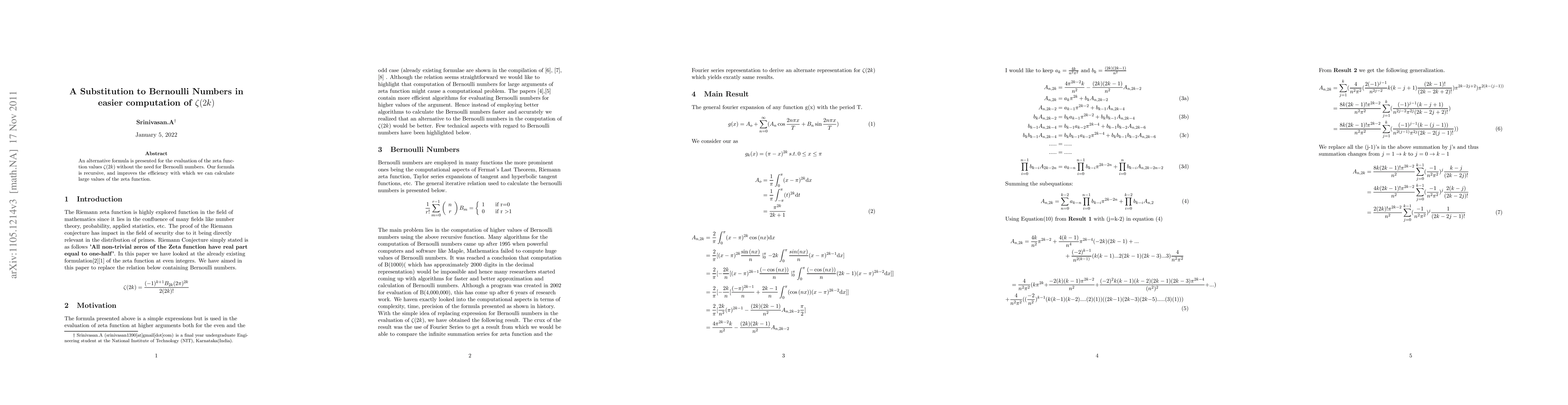 An alternative formula is presented for the evaluation of the zeta function values $\zeta(2k)$ without the need for Bernoulli numbers. Our formula is recursive, and improves the efficiency with which we can calculate large values of the zeta function.