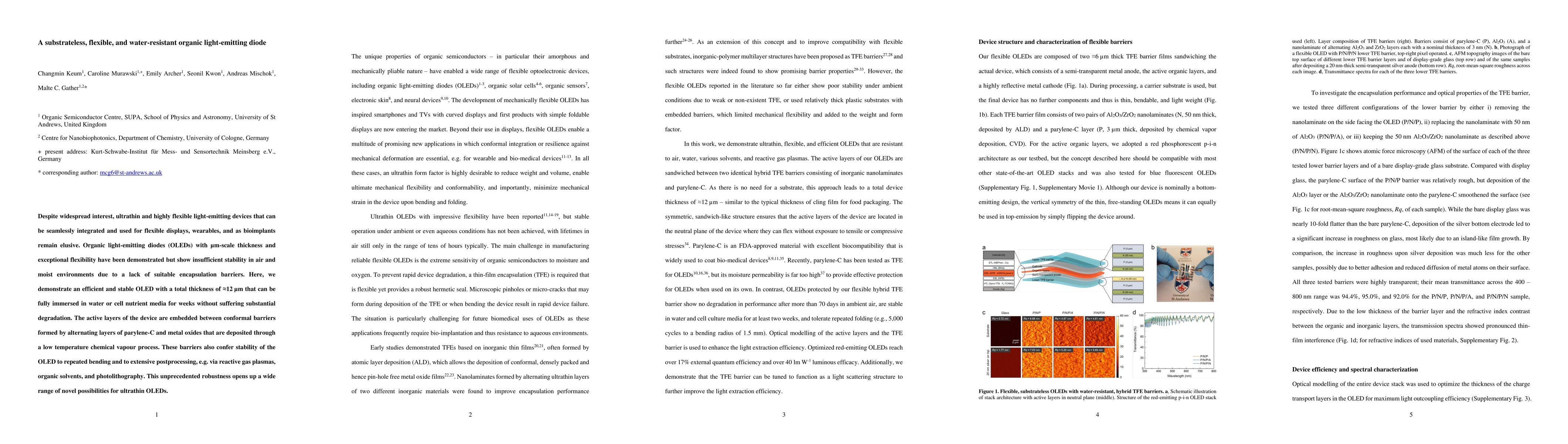 This paper presents an ultrathin, flexible, and water-resistant organic light-emitting diode (OLED) with a total thickness of approximately 12 µm, protected by conformal barriers of parylene-C and metal oxides. The device maintains stability in water and various harsh environments, enabling potential applications in flexible displays, wearables, and bioimplants.