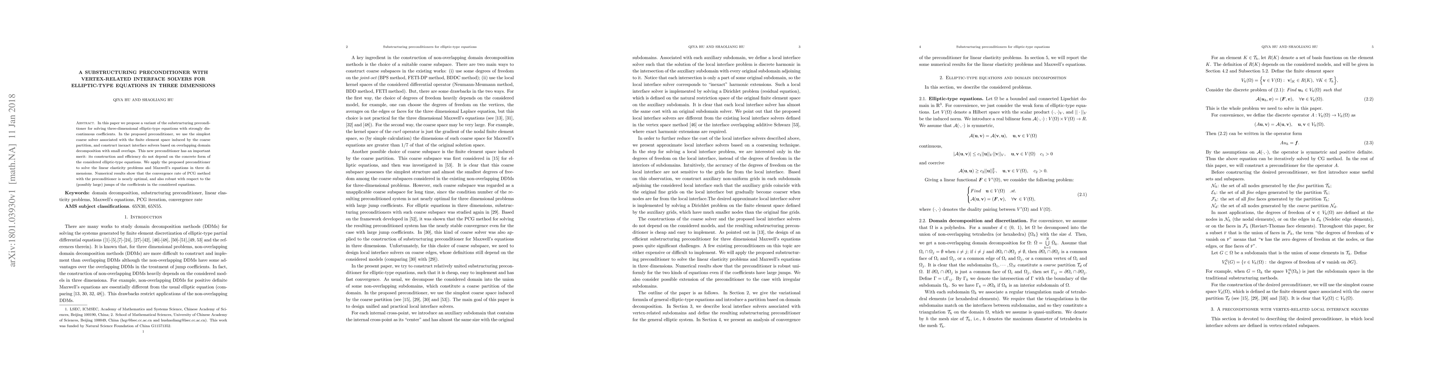 Researchers propose a new substructuring preconditioner for solving 3D elliptic-type equations with discontinuous coefficients, achieving near-optimal convergence rates and robustness to large coefficient jumps.