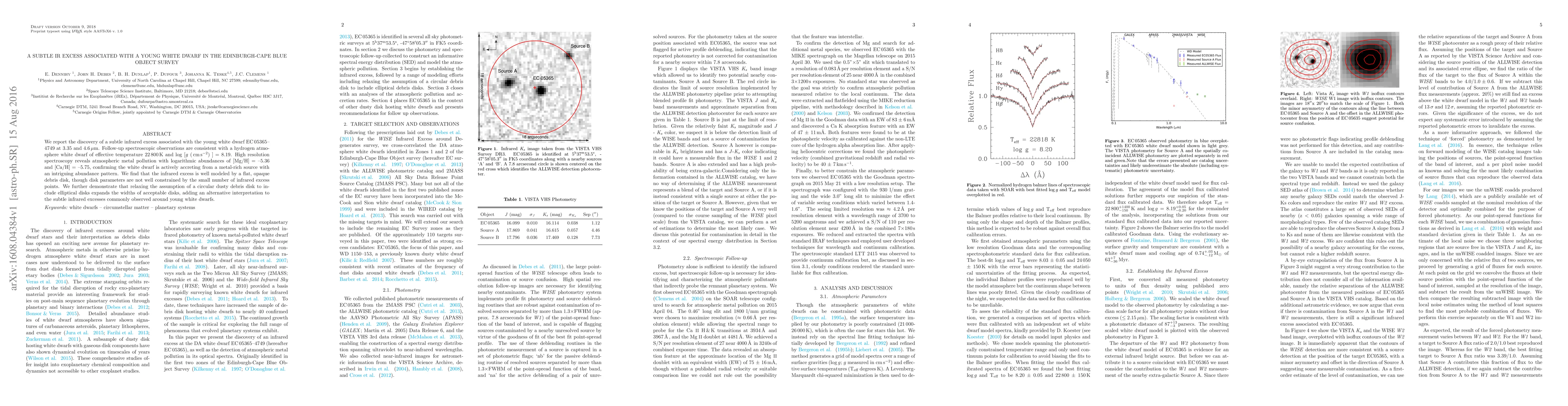 We report the discovery of a subtle infrared excess associated with the young white dwarf EC\,05365--4749 at 3.35 and 4.6\,$\mu$m. Follow-up spectroscopic observations are consistent with a hydrogen atmosphere white dwarf of effective temperature 22\,800\,K and log [\emph{g} (\,cm\,s$^{-2}$) ] = 8.19. High resolution spectroscopy reveals atmospheric metal pollution with logarithmic abundances of [Mg/H] = --5.36 and [Ca/H] = --5.75, confirming the white dwarf is actively accreting from a metal-rich source with an intriguing abundance pattern. We find that the infrared excess is well modeled by a flat, opaque debris disk, though disk parameters are not well constrained by the small number of infrared excess points. We further demonstrate that relaxing the assumption of a circular dusty debris disk to include elliptical disks expands the widths of acceptable disks, adding an alternative interpretation to the subtle infrared excesses commonly observed around young white dwarfs.