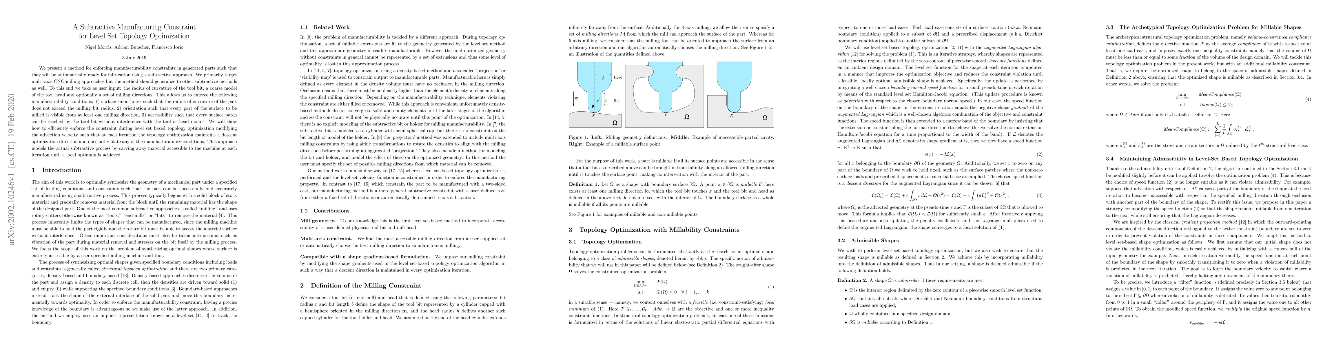 We present a method for enforcing manufacturability constraints in generated parts such that they will be automatically ready for fabrication using a subtractive approach. We primarily target multi-axis CNC milling approaches but the method should generalize to other subtractive methods as well. To this end, we take as user input: the radius of curvature of the tool bit, a coarse model of the tool head and optionally a set of milling directions. This allows us to enforce the following manufacturability conditions: 1) surface smoothness such that the radius of curvature of the part does not exceed the milling bit radius, 2) orientation such that every part of the surface to be milled is visible from at least one milling direction, 3) accessibility such that every surface patch can be reached by the tool bit without interference with the tool or head mount. We will show how to efficiently enforce the constraint during level set-based topology optimization modifying the advection velocity such that at each iteration the topology optimization maintains a descent optimization direction and does not violate any of the manufacturability conditions. This approach models the actual subtractive process by carving away material accessible to the machine at each iteration until a local optimum is achieved.