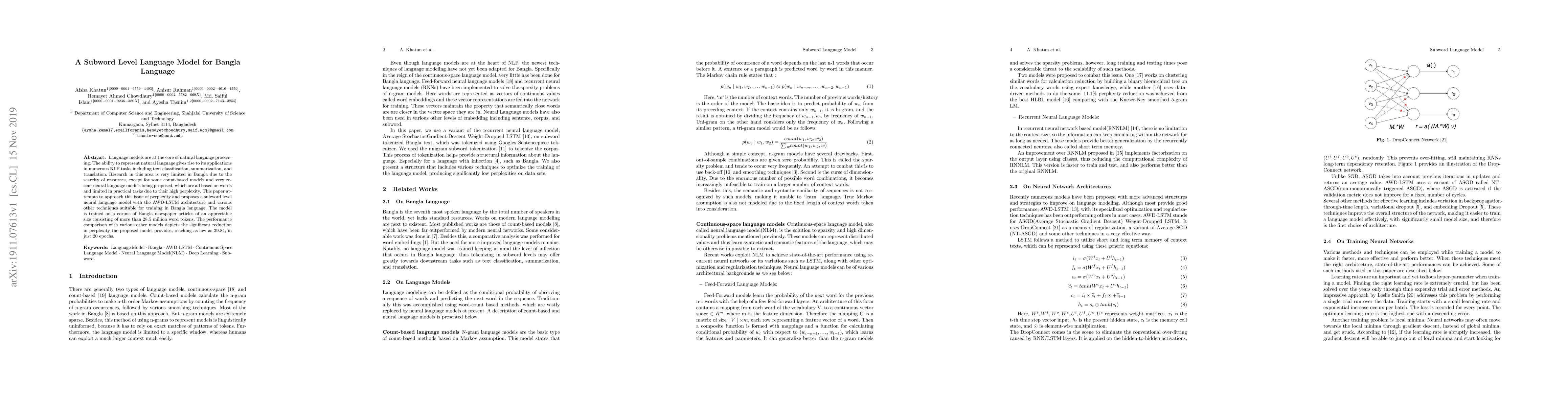 This paper introduces a subword level neural language model for Bangla using the AWD-LSTM architecture, trained on a large corpus of Bangla newspaper articles. The model demonstrates a significant reduction in perplexity compared to word-based models, achieving a low perplexity of 39.84 in just 20 epochs.