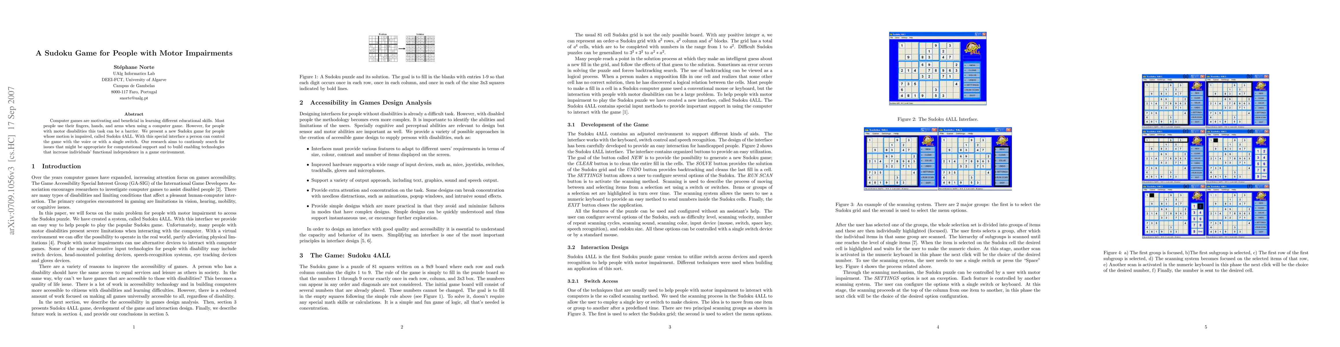 Computer games are motivating and beneficial in learning different educational skills. Most people use their fingers, hands, and arms when using a computer game. However, for people with motor disabilities this task can be a barrier. We present a new Sudoku game for people whose motion is impaired, called Sudoku 4ALL. With this special interface a person can control the game with the voice or with a single switch. Our research aims to cautiously search for issues that might be appropriate for computational support and to build enabling technologies that increase individuals' functional independence in a game environment.