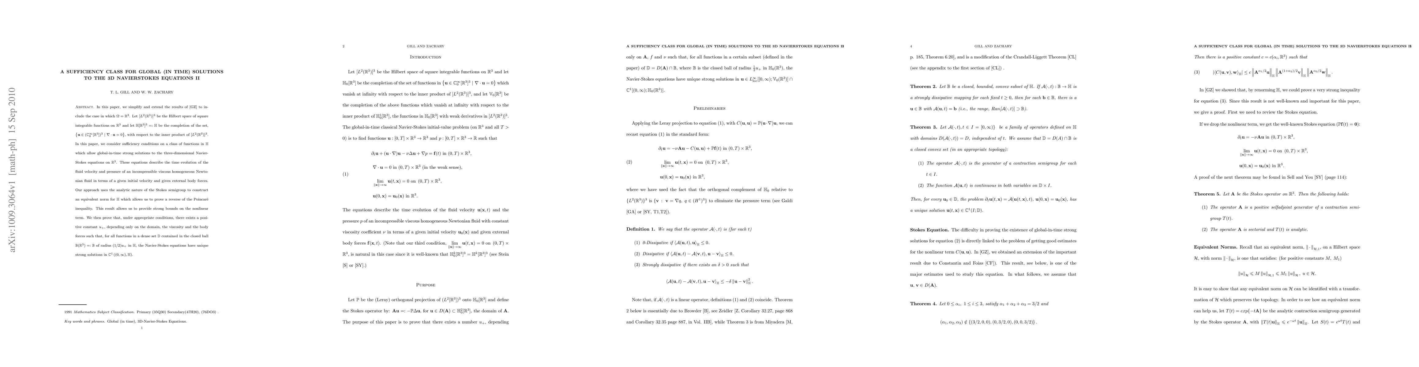 In this paper, we simplify and extend the results of \cite{GZ} to include the case in which $\Om =\R^3$. Let ${[L^2({\mathbb{R}}^3)]^3}$ be the Hilbert space of square integrable functions on ${\mathbb {R}}^3 $ and let ${\mathbb H}[{\mathbb{R}}^3]^3 =: {\mathbb H}$ be the completion of the set, ${{{\bf{u}} \in (\mathbb {C}_0^\infty [ \R^3 ])^3. {} | \nabla \cdot {\bf{u}} = 0}}$, with respect to the inner product of ${[L^2({\mathbb{R}}^3)]^3} $. In this paper, we consider sufficiency conditions on a class of functions in ${\mathbb H}$ which allow global-in-time strong solutions to the three-dimensional Navier-Stokes equations on ${\mathbb {R}}^3$. These equations describe the time evolution of the fluid velocity and pressure of an incompressible viscous homogeneous Newtonian fluid in terms of a given initial velocity and given external body forces. Our approach uses the analytic nature of the Stokes semigroup to construct an equivalent norm for $\mathbb{H}$ which allows us to prove a reverse of the Poincar\'e inequality. This result allows us to provide strong bounds on the nonlinear term. We then prove that, under appropriate conditions, there exists a positive constant $ {{u}_+}$, depending only on the domain, the viscosity and the body forces such that, for all functions in a dense set $\mathbb{D}$ contained in the closed ball ${{\mathbb B} ({\mathbb {R}}^3)}=: {\mathbb B}$ of radius $ (1/2){{u}_ +} $ in ${\mathbb {H}}$, the Navier-Stokes equations have unique strong solutions in ${\mathbb C}^{1} ({(0,\infty),{\mathbb {H}}})$.