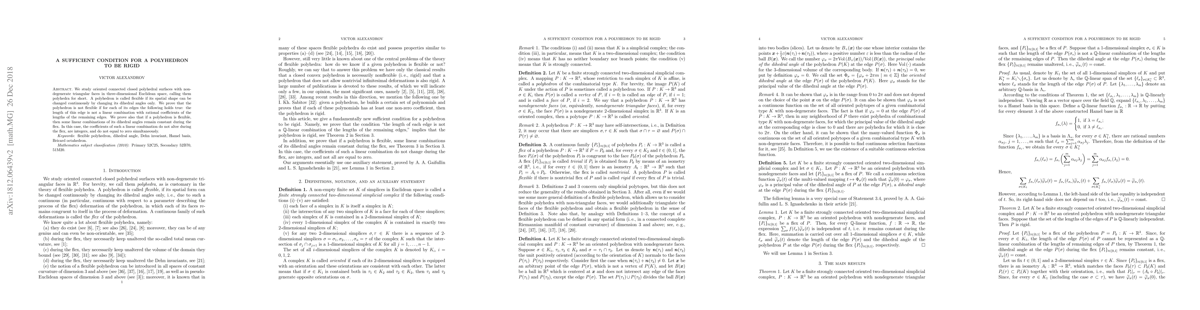 We study oriented connected closed polyhedral surfaces with non-degenerate triangular faces in three-dimensional Euclidean space, calling them polyhedra for short. A polyhedron is called flexible if its spatial shape can be changed continuously by changing its dihedral angles only. We prove that the polyhedron is not flexible if for each of its edges the following holds true: the length of this edge is not a linear combination with rational coefficients of the lengths of the remaining edges. We prove also that if a polyhedron is flexible, then some linear combinations of its dihedral angles remain constant during the flex. In this case, the coefficients of such a linear combination do not alter during the flex, are integers, and do not equal to zero simultaneously.