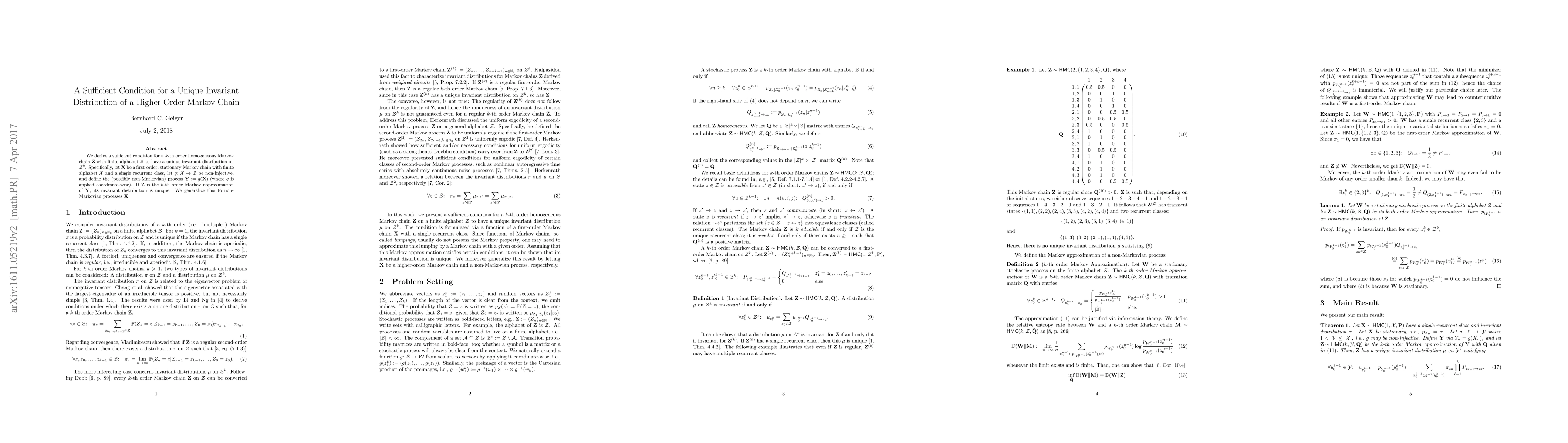 We derive a sufficient condition for a $k$-th order homogeneous Markov chain $\mathbf{Z}$ with finite alphabet $\mathcal{Z}$ to have a unique invariant distribution on $\mathcal{Z}^k$. Specifically, let $\mathbf{X}$ be a first-order, stationary Markov chain with finite alphabet $\mathcal{X}$ and a single recurrent class, let $g{:}\ \mathcal{X}\to\mathcal{Z}$ be non-injective, and define the (possibly non-Markovian) process $\mathbf{Y}:=g(\mathbf{X})$ (where $g$ is applied coordinate-wise). If $\mathbf{Z}$ is the $k$-th order Markov approximation of $\mathbf{Y}$, its invariant distribution is unique. We generalize this to non-Markovian processes $\mathbf{X}$.