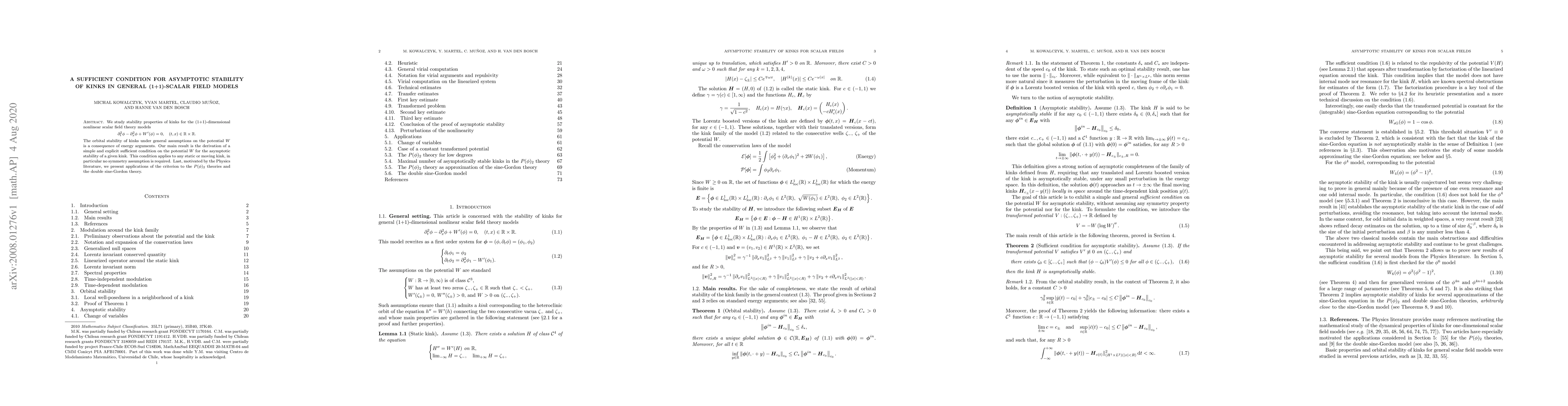 We study stability properties of kinks for the (1+1)-dimensional nonlinear scalar field theory models \begin{equation*} \partial_t^2\phi -\partial_x^2\phi + W'(\phi) = 0, \quad (t,x)\in\mathbb{R}\times\mathbb{R}. \end{equation*} The orbital stability of kinks under general assumptions on the potential $W$ is a consequence of energy arguments. Our main result is the derivation of a simple and explicit sufficient condition on the potential $W$ for the asymptotic stability of a given kink. This condition applies to any static or moving kink, in particular no symmetry assumption is required. Last, motivated by the Physics literature, we present applications of the criterion to the $P(\phi)_2$ theories and the double sine-Gordon theory.