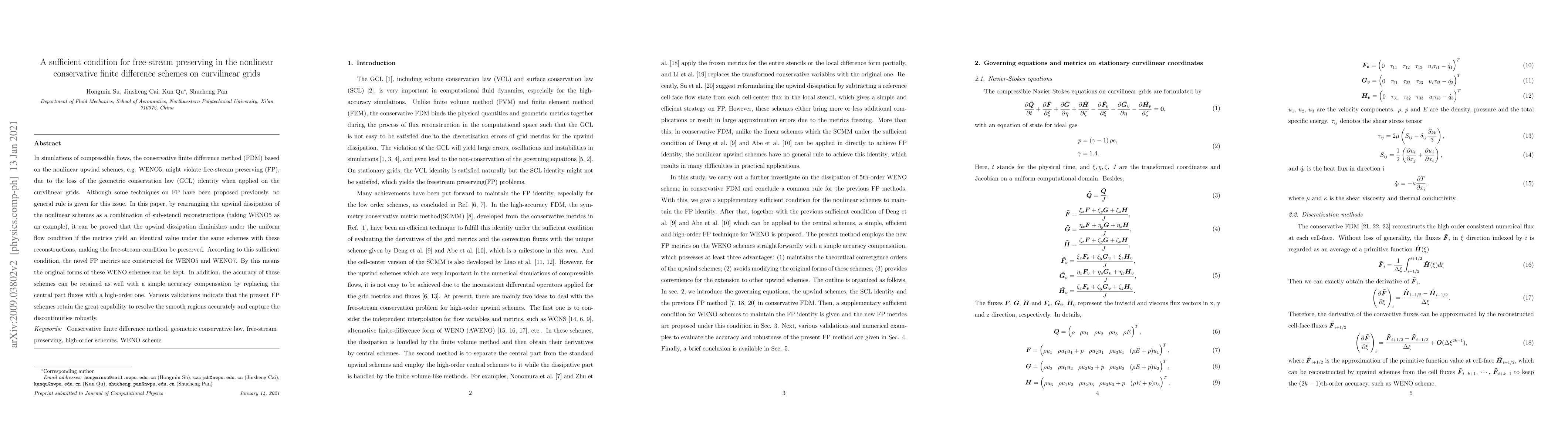 In simulations of compressible flows, the conservative finite difference method (FDM) based on the nonlinear upwind schemes, e.g. WENO5, might violate free-stream preserving (FP), due to the loss of the geometric conservation law (GCL) identity when applied on the curvilinear grids. Although some techniques on FP have been proposed previously, no general rule is given for this issue. In this paper, by rearranging the upwind dissipation of the nonlinear schemes as a combination of sub-stencil reconstructions (taking WENO5 as an example), it can be proved that the upwind dissipation diminishes under the uniform flow condition if the metrics yield an identical value under the same schemes with these reconstructions, making the free-stream condition be preserved. According to this sufficient condition, the novel FP metrics are constructed for WENO5 and WENO7. By this means the original forms of these WENO schemes can be kept. In addition, the accuracy of these schemes can be retained as well with a simple accuracy compensation by replacing the central part fluxes with a high-order one. Various validations indicate that the present FP schemes retain the great capability to resolve the smooth regions accurately and capture the discontinuities robustly.