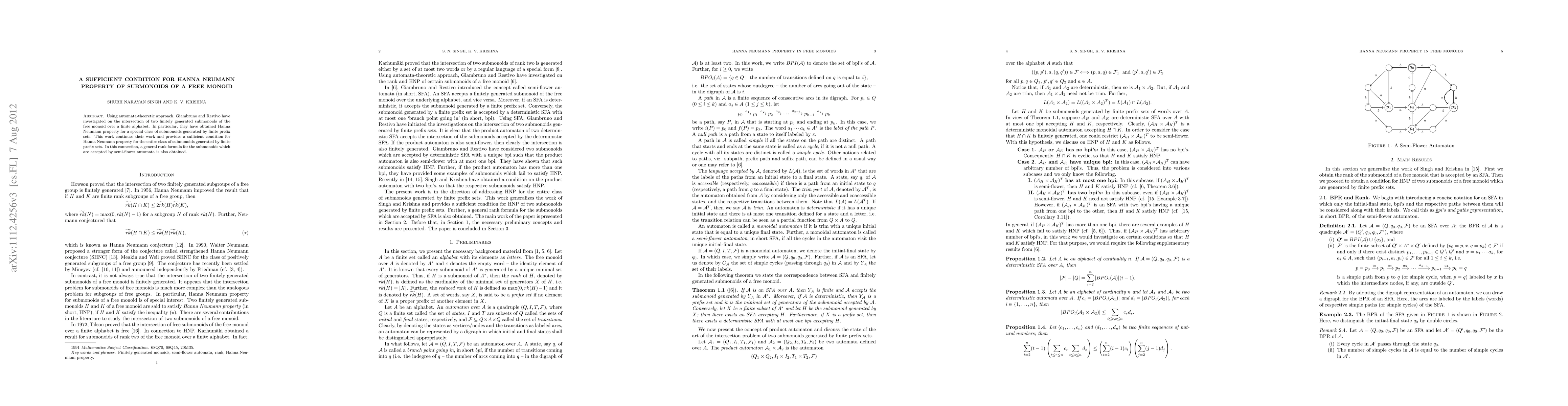 This paper extends previous work on the Hanna Neumann property for submonoids of a free monoid, providing a sufficient condition for the property for all submonoids generated by finite prefix sets, and introduces a rank formula for submonoids recognized by semi-flower automata.