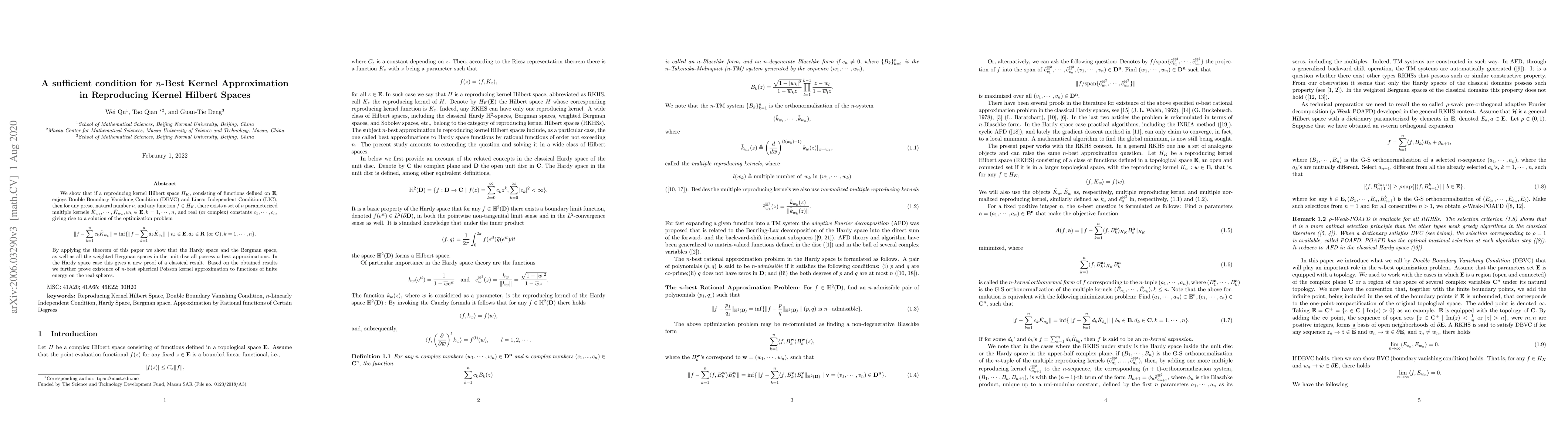 This paper establishes a sufficient condition for n-best kernel approximation in reproducing kernel Hilbert spaces, showing that if a space satisfies Double Boundary Vanishing Condition and Linear Independent Condition, it guarantees n-best approximations for any function in the space. The results apply to Hardy, Bergman, and weighted Bergman spaces, and extend to n-best spherical Poisson kernel approximations on real-spheres.