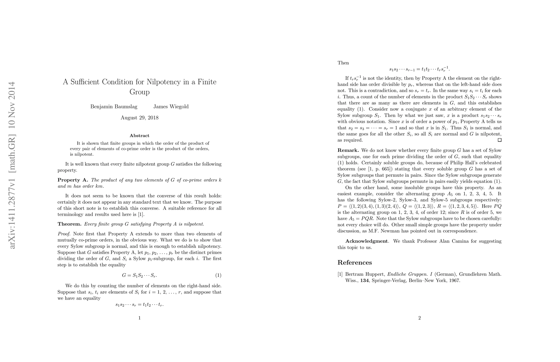 It is shown that finite groups in which the order of the product of every pair of elements of co-prime order is the product of the orders, is nilpotent.