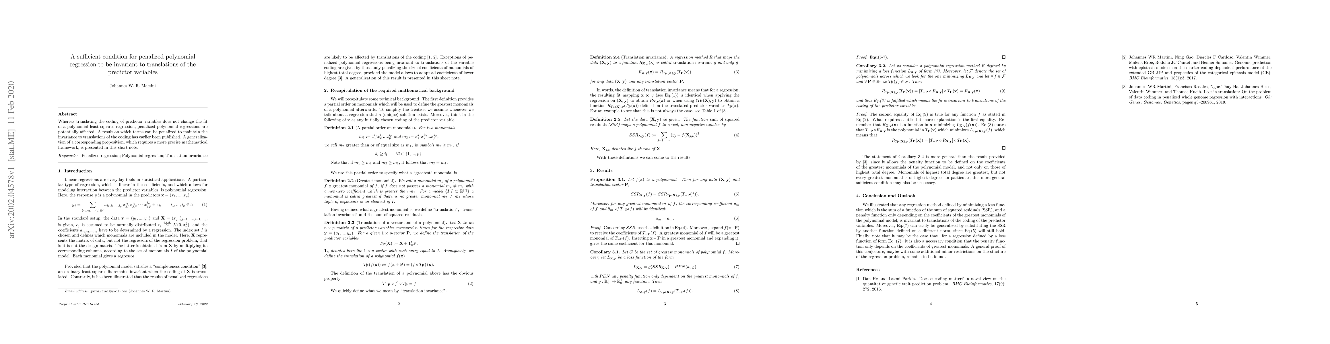 Whereas translating the coding of predictor variables does not change the fit of a polynomial least squares regression, penalized polynomial regressions are potentially affected. A result on which terms can be penalized to maintain the invariance to translations of the coding has earlier been published. A generalization of a corresponding proposition, which requires a more precise mathematical framework, is presented in this short note.