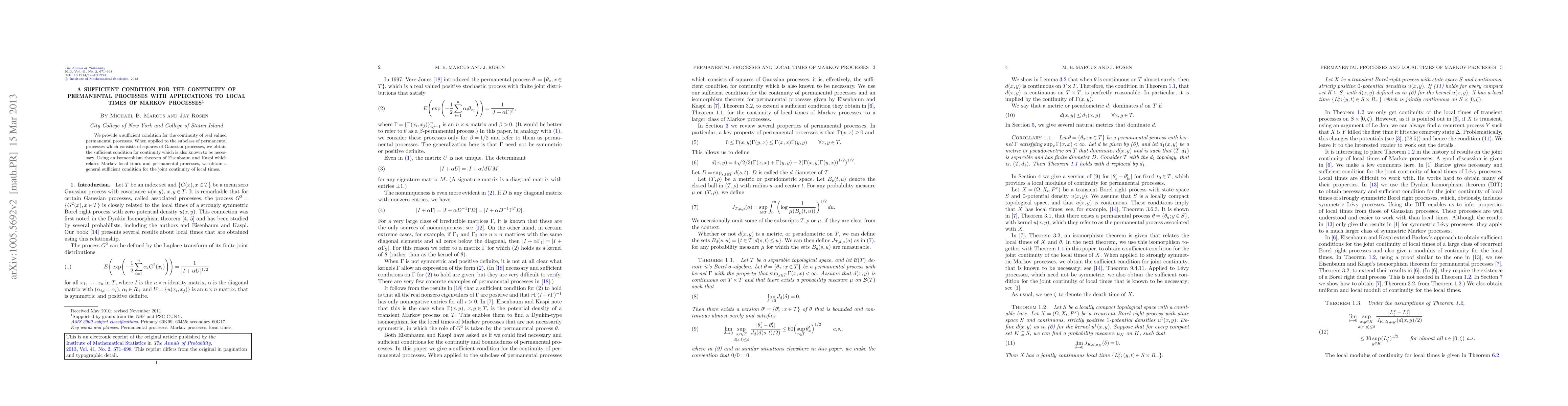 This paper establishes a sufficient condition for the continuity of real valued permanental processes, particularly for those derived from Gaussian processes. It also extends this to provide a general sufficient condition for the joint continuity of Markov local times via an isomorphism theorem.