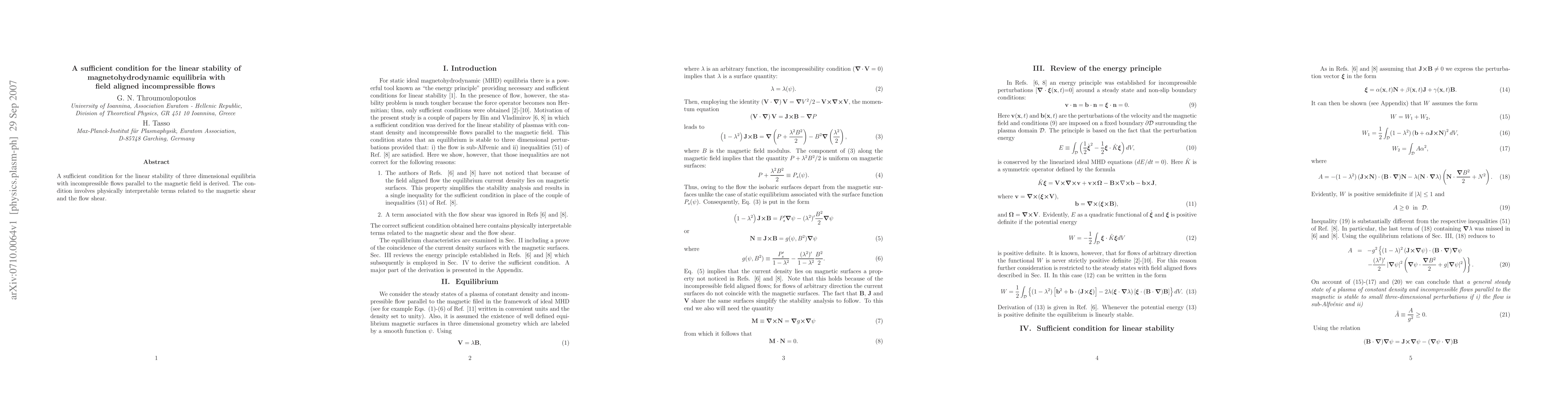 Summary: This paper derives a sufficient condition for the linear stability of three-dimensional magnetohydrodynamic equilibria with incompressible flows aligned with the magnetic field, involving terms related to magnetic and flow shear.