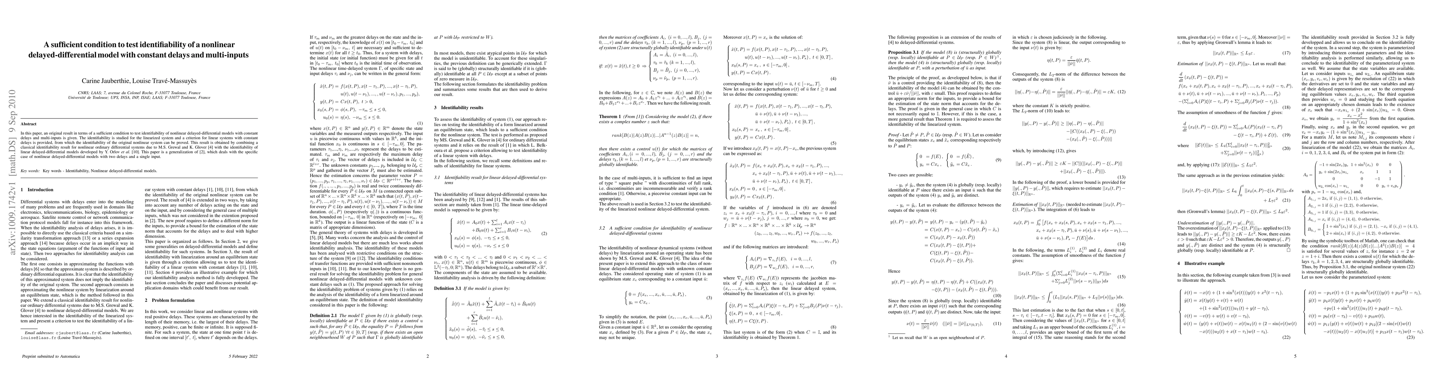 In this paper, an original result in terms of a sufficient condition to test identifiability of nonlinear delayed-differential models with constant delays and multi-inputs is given. The identifiability is studied for the linearized system and a criterion for linear systems with constant delays is provided, from which the identifiability of the original nonlinear system can be proved. This result is obtained by combining a classical identifiability result for nonlinear ordinary differential systems due to M.S. Grewal and K. Glover (1976) with the identifiability of linear delayed-differential models developed by Y. Orlov et al. (2002). This paper is a generalization of the results provided by L. Denis-Vidal, C. Jauberthie, G. Joly-Blanchard (2006), which deal with the specific case of nonlinear delayed-differential models with two delays and a single input.