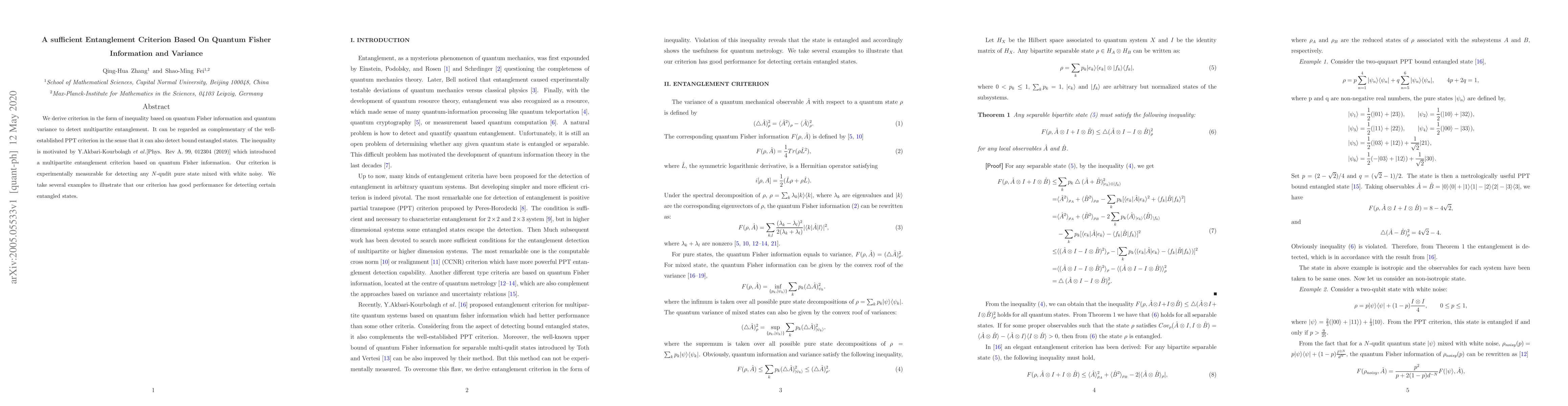 This paper proposes a new entanglement criterion based on quantum Fisher information and variance, which can detect bound entangled states and complements the PPT criterion. The criterion is experimentally measurable and demonstrates good performance in detecting entangled states in mixed states with noise.