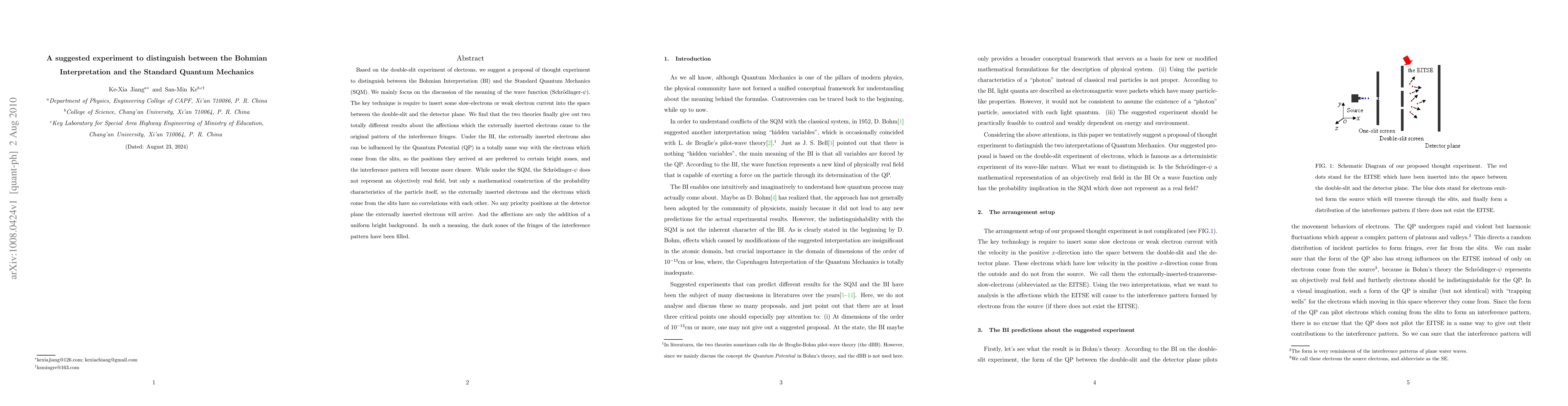 This paper proposes a thought experiment based on the double-slit experiment to differentiate between Bohmian Interpretation and Standard Quantum Mechanics. It suggests that under Bohmian Interpretation, the inserted electrons will follow a preferred path influenced by the Quantum Potential, enhancing the interference pattern, while under Standard Quantum Mechanics, the inserted electrons will not correlate with the original electrons, resulting in a uniform bright background filling the dark zones.