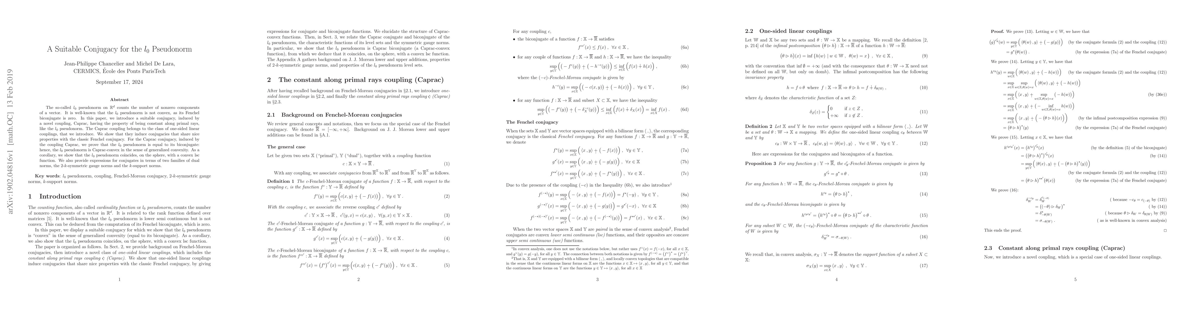 The so-called l0 pseudonorm on R d counts the number of nonzero components of a vector. It is well-known that the l0 pseudonorm is not convex, as its Fenchel biconjugate is zero. In this paper, we introduce a suitable conjugacy, induced by a novel coupling, Caprac, having the property of being constant along primal rays, like the l0 pseudonorm. The Caprac coupling belongs to the class of one-sided linear couplings, that we introduce. We show that they induce conjugacies that share nice properties with the classic Fenchel conjugacy. For the Caprac conjugacy, induced by the coupling Caprac, we prove that the l0 pseudonorm is equal to its biconjugate: hence, the l0 pseudonorm is Caprac-convex in the sense of generalized convexity. As a corollary, we show that the l0 pseudonorm coincides, on the sphere, with a convex lsc function. We also provide expressions for conjugates in terms of two families of dual norms, the 2-k-symmetric gauge norms and the k-support norms.