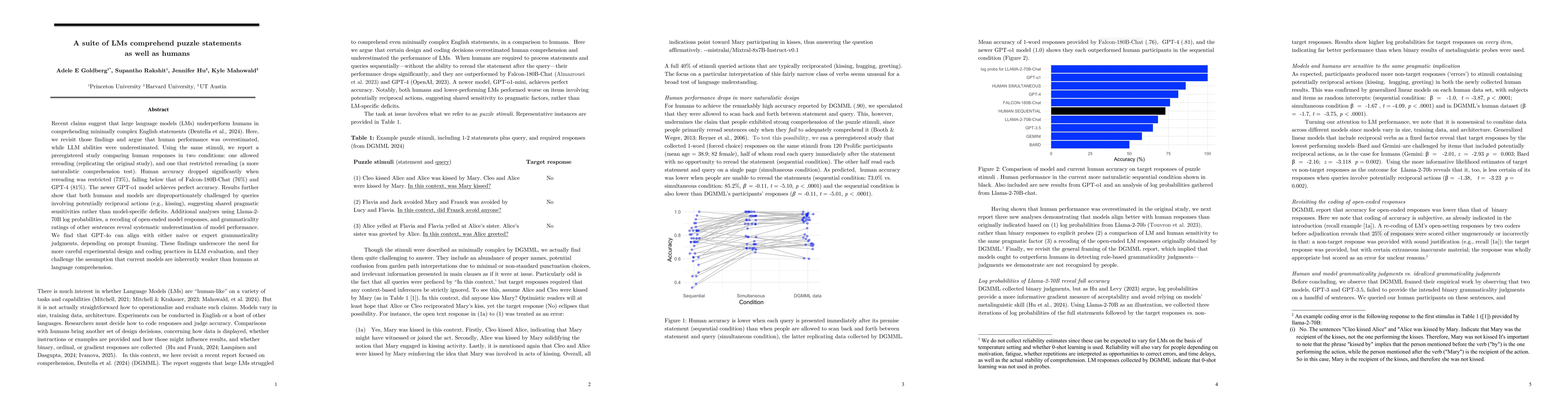 The paper presents a detailed comparison of human and LLM performance on puzzle statement comprehension, employing rigorous methodology and additional analyses to challenge previous claims about model limitations.