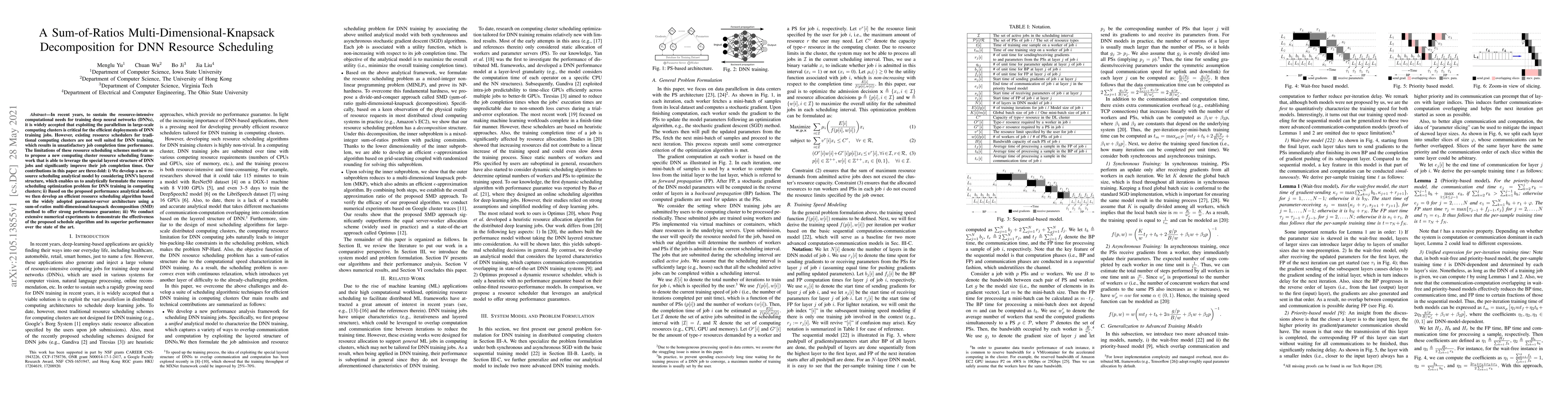 This paper proposes a new resource scheduling framework for training deep neural networks (DNNs) in computing clusters, leveraging their layered structure. The authors develop an analytical model and an efficient scheduling algorithm using a sum-of-ratios multi-dimensional-knapsack decomposition method, demonstrating superior performance over existing methods through extensive experiments.