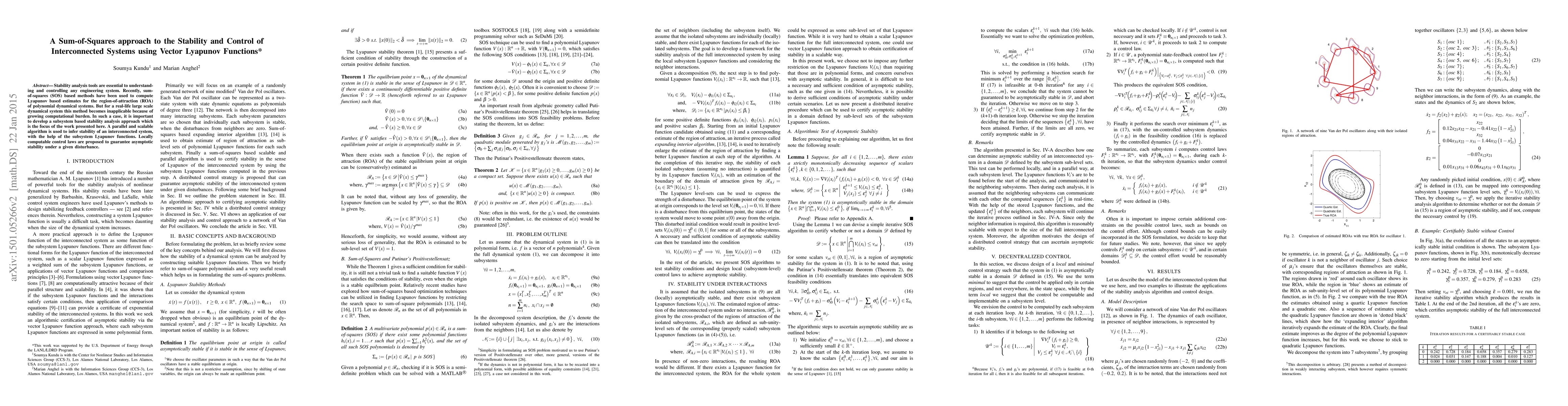 This paper proposes a scalable sum-of-squares approach for stability and control of large-scale interconnected systems using vector Lyapunov functions. It introduces a parallel algorithm for subsystem-based stability analysis and locally computable control laws to ensure asymptotic stability despite disturbances.