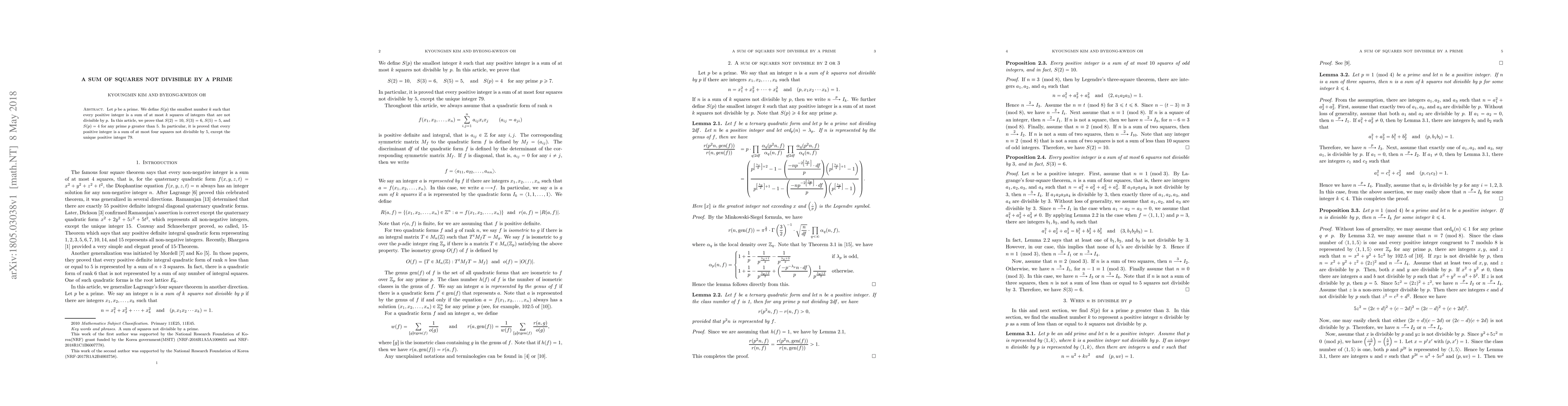 This paper investigates the smallest number $k$ such that every positive integer can be expressed as a sum of at most $k$ squares of integers not divisible by a given prime $p$. The authors prove that $S(2)=10$, $S(3)=6$, $S(5)=5$, and $S(p)=4$ for primes $p > 5$, with the exception of the integer $79$ which cannot be expressed as a sum of four such squares.