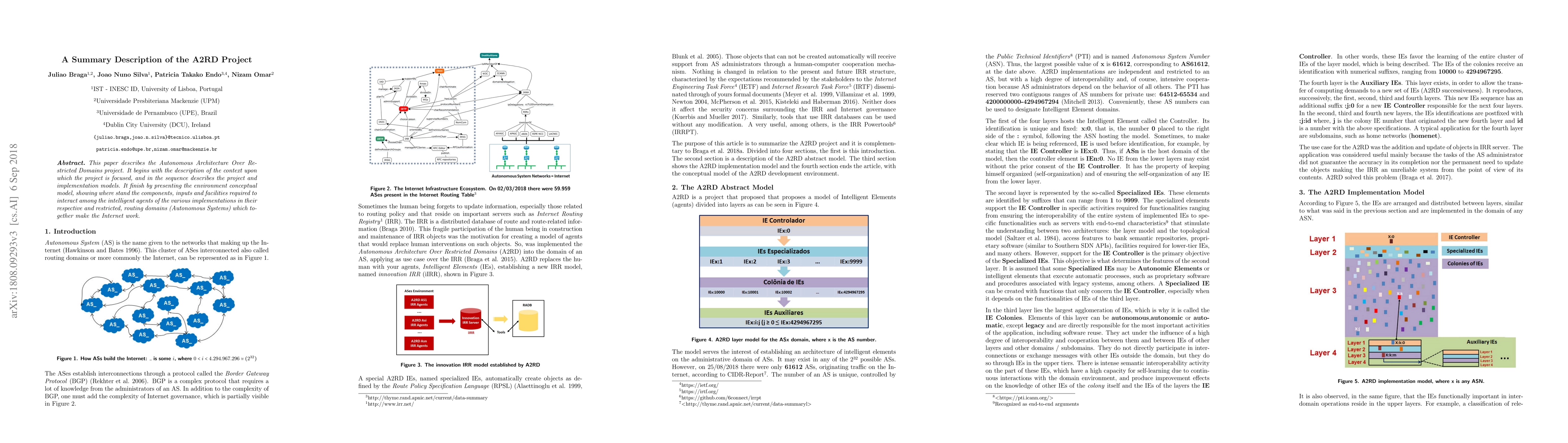 The A2RD project focuses on Autonomous Architecture Over Restricted Domains, detailing its context, project and implementation models, and environment conceptual model. It illustrates how intelligent agents in distinct, interconnected routing domains (Autonomous Systems) collaborate to function the Internet.