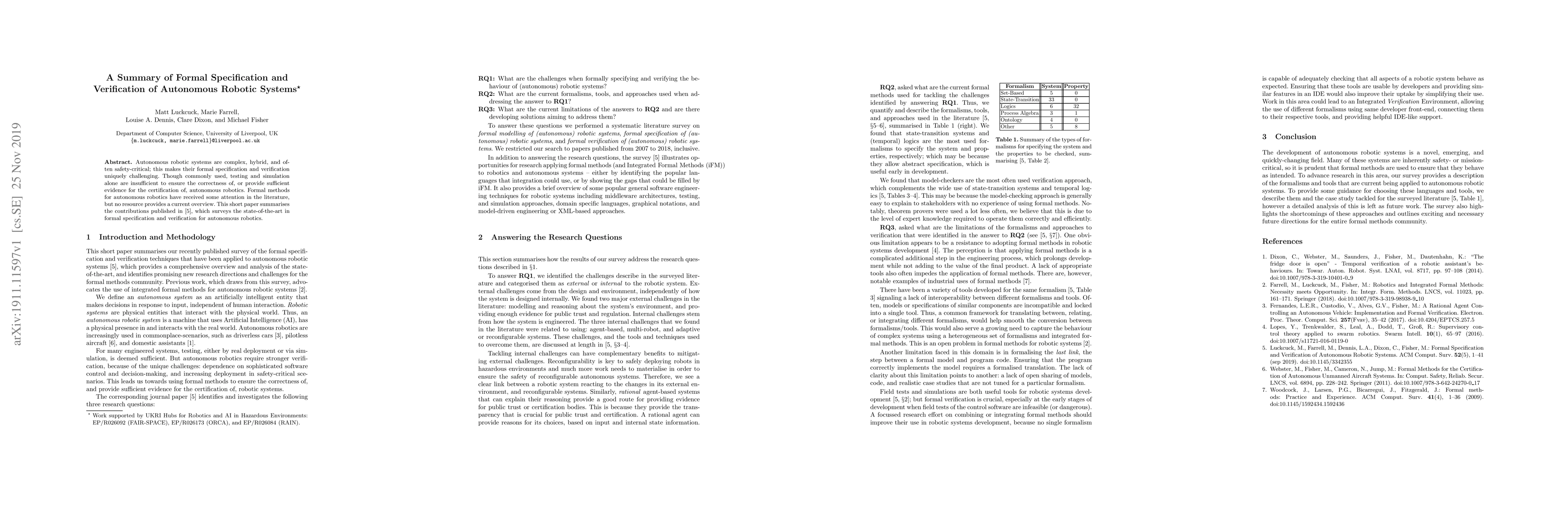 This paper summarizes the state-of-the-art in formal specification and verification for autonomous robotic systems, highlighting the limitations of testing and simulation, and reviewing contributions from Luckcuck 2019 on the topic.