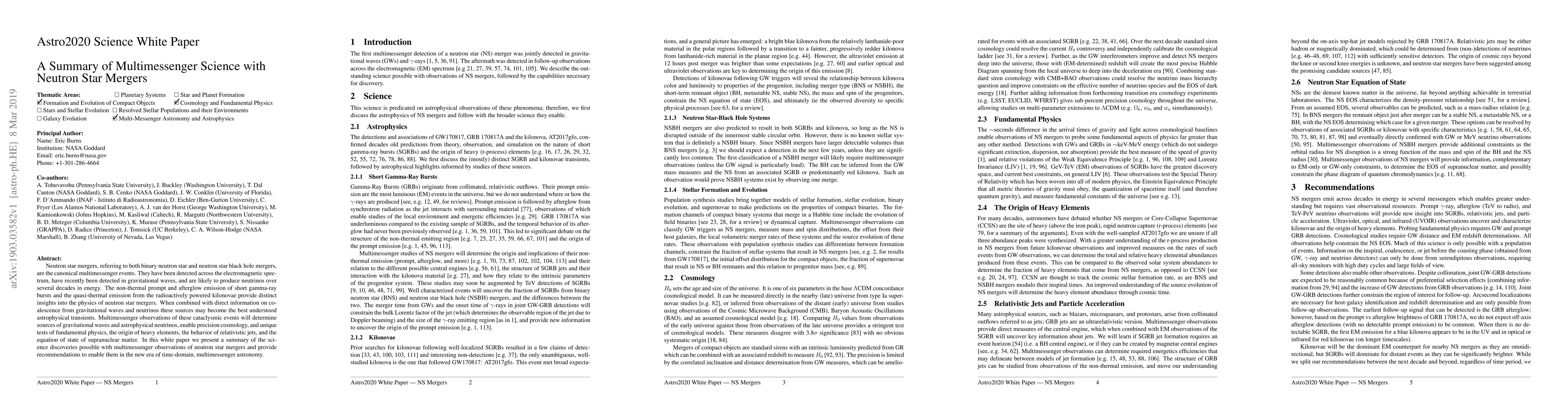 Neutron star mergers, referring to both binary neutron star and neutron star black hole mergers, are the canonical multimessenger events. They have been detected across the electromagnetic spectrum, have recently been detected in gravitational waves, and are likely to produce neutrinos over several decades in energy. The non-thermal prompt and afterglow emission of short gamma-ray bursts and the quasi-thermal emission from the radioactively powered kilonovae provide distinct insights into the physics of neutron star mergers. When combined with direct information on coalescence from gravitational waves and neutrinos these sources may become the best understood astrophysical transients. Multimessenger observations of these cataclysmic events will determine sources of gravitational waves and astrophysical neutrinos, enable precision cosmology, and unique tests of fundamental physics, the origin of heavy elements, the behavior of relativistic jets, and the equation of state of supranuclear matter. In this white paper we present a summary of the science discoveries possible with multimessenger observations of neutron star mergers and provide recommendations to enable them in the new era of time-domain, multimessenger astronomy.