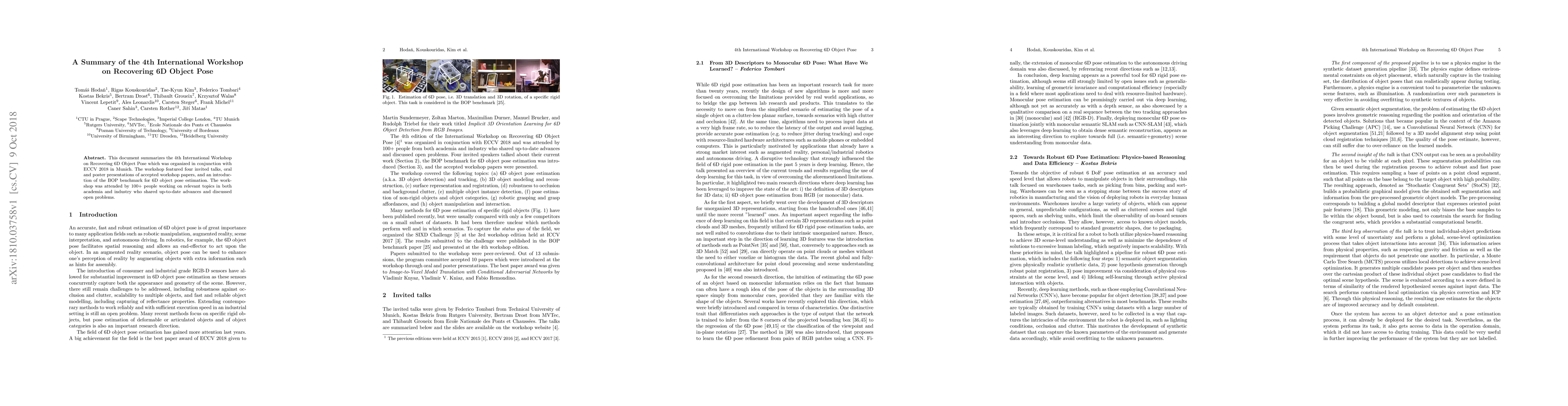 This document summarizes the 4th International Workshop on Recovering 6D Object Pose which was organized in conjunction with ECCV 2018 in Munich. The workshop featured four invited talks, oral and poster presentations of accepted workshop papers, and an introduction of the BOP benchmark for 6D object pose estimation. The workshop was attended by 100+ people working on relevant topics in both academia and industry who shared up-to-date advances and discussed open problems.