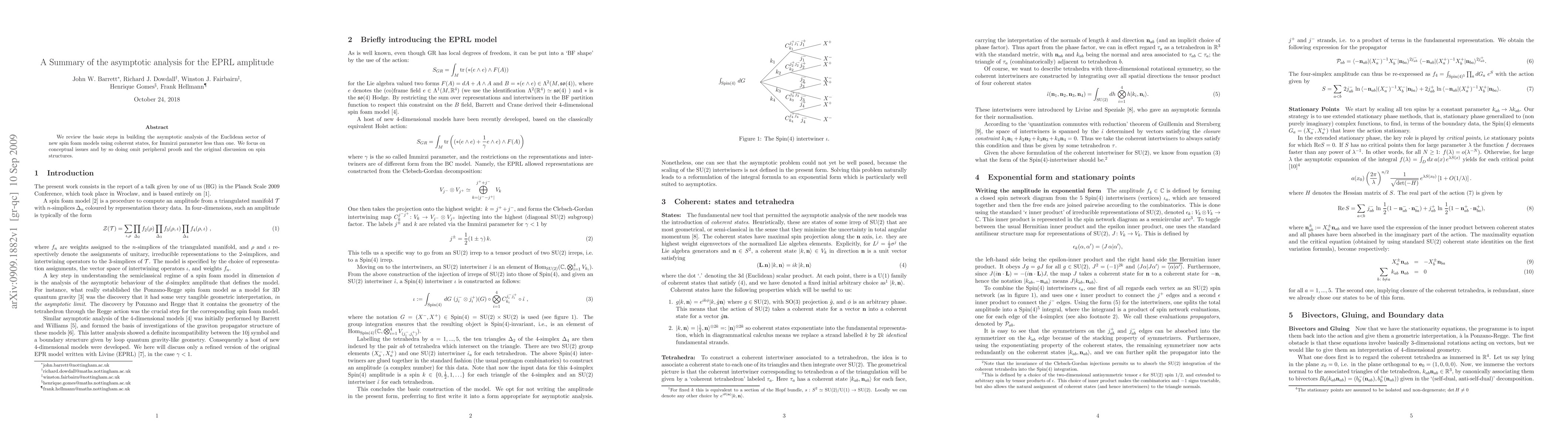 We review the basic steps in building the asymptotic analysis of the Euclidean sector of new spin foam models using coherent states, for Immirzi parameter less than one. We focus on conceptual issues and by so doing omit peripheral proofs and the original discussion on spin structures.