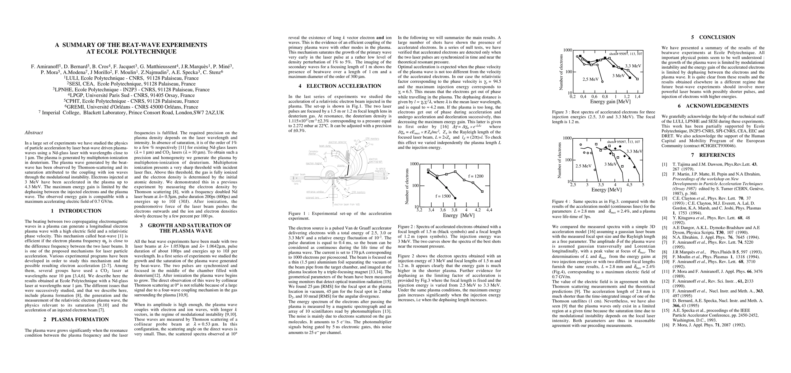 We present a summary of the beatwave particle acceleration program developed at Ecole Polytechnique. In dedicated experiments, plasma formation, plasma wave generation and saturation, and particle acceleration were successively studied and understood in detail. A maximum energy gain of 1.3 MeV was obtained, which is compatible with an accelerating gradient of 0.7 GV/m.
