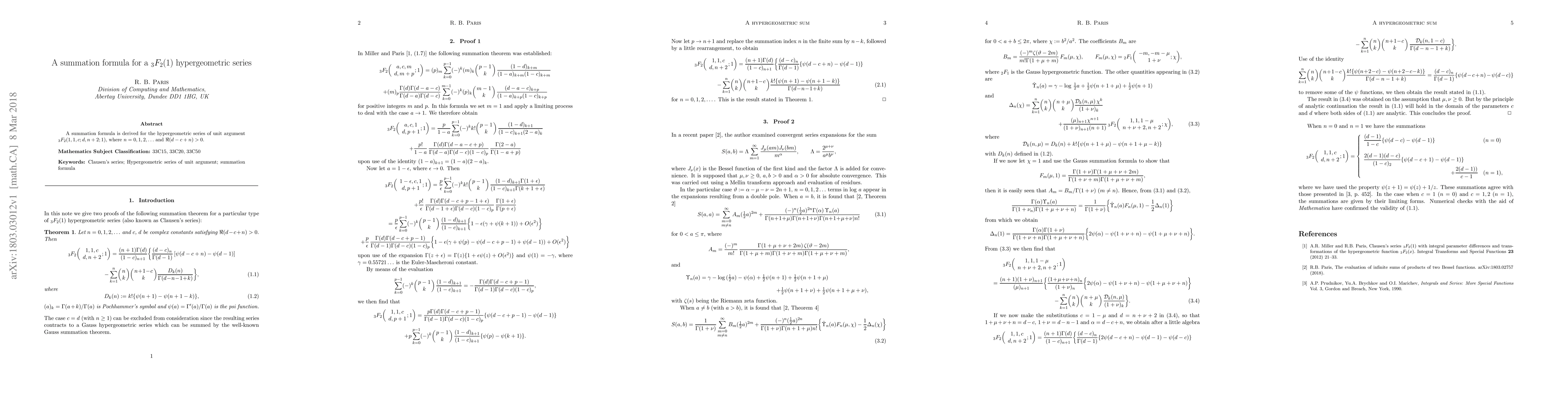 A summation formula is derived for the hypergeometric series of unit argument ${}_3F_2(1,1,c;d,n+2;1)$, where $n=0, 1, 2, \ldots$ and $\Re (d-c+n)>0$.