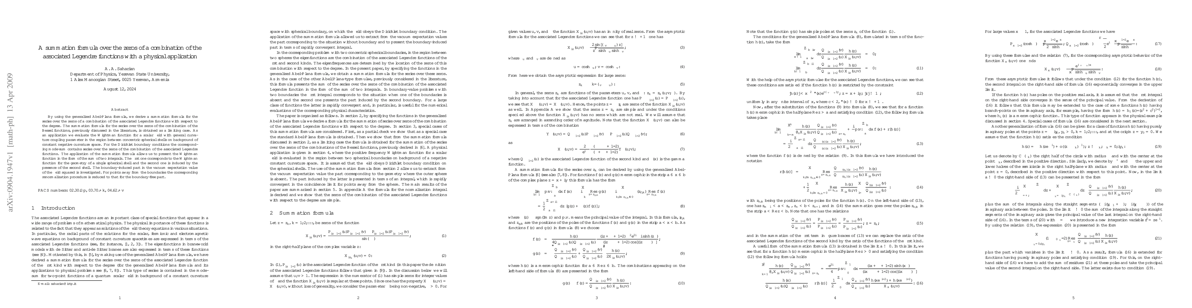 This paper derives a summation formula for zeros of associated Legendre functions using the generalized Abel-Plana formula, and applies it to evaluate the Wightman function for a scalar field in a spherical shell geometry with Dirichlet boundary conditions, presenting it as a sum of two integrals.