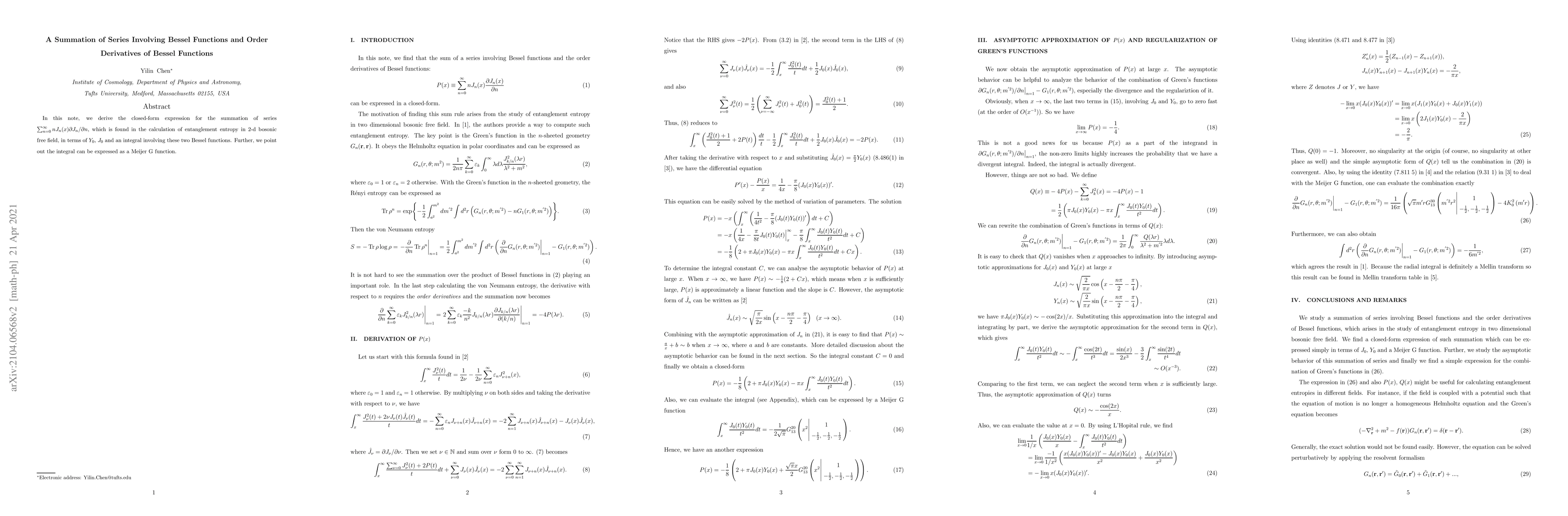 Researchers derived a closed-form expression for the summation of series involving Bessel functions, linking it to Meijer G functions and two specific Bessel functions, with implications in entanglement entropy calculations.