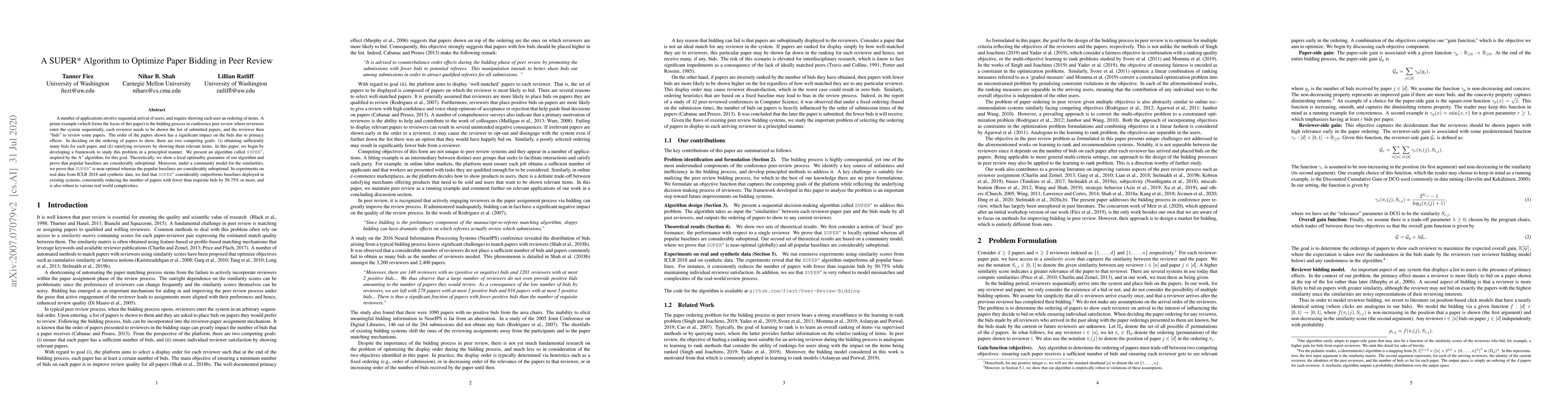 This paper introduces SUPER*, an algorithm inspired by A* for optimizing paper bidding in conference peer review. It demonstrates superior performance over baselines by balancing the goals of obtaining sufficient bids and showing relevant papers to reviewers, achieving a 50-75% reduction in papers with insufficient bids.